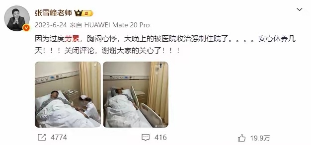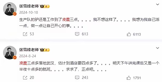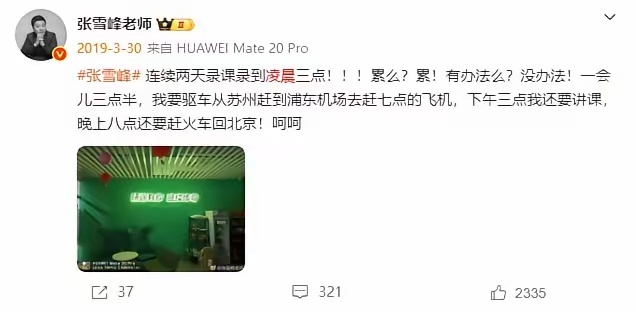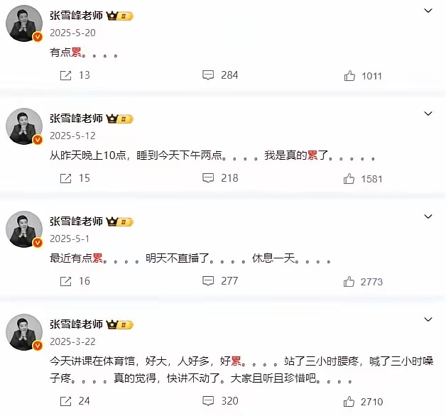 张雪峰微博曾5次提及猝死 张雪峰近几年微博提到最多的字就是累,可以看出来,他是真的很累,在很累的情况下还要去跑步,去跑马拉松,每天都超负荷工作,累到了极限。避谶张雪峰员工 上四休三