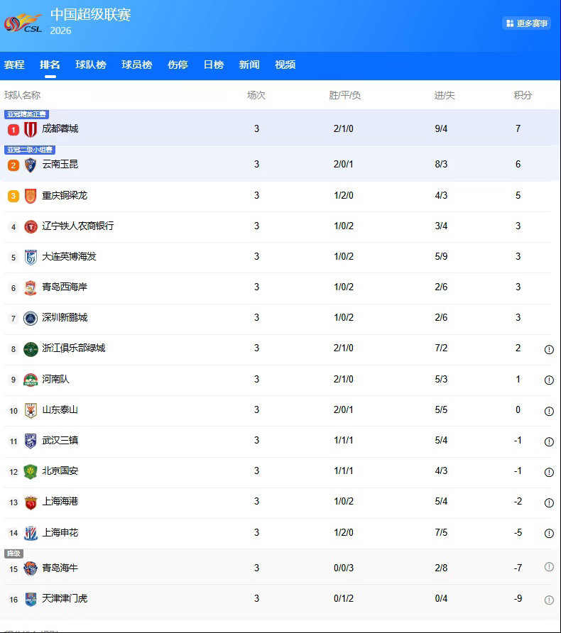 2026赛季中超联赛第三轮赛事全部结束,最新积分榜正式出炉。成都蓉城以7分暂列榜首,云南玉昆、重庆铜梁龙紧随其后,而传统豪门山东泰山因违规扣分仍积0分,新赛季联赛格局迎来全新变化。