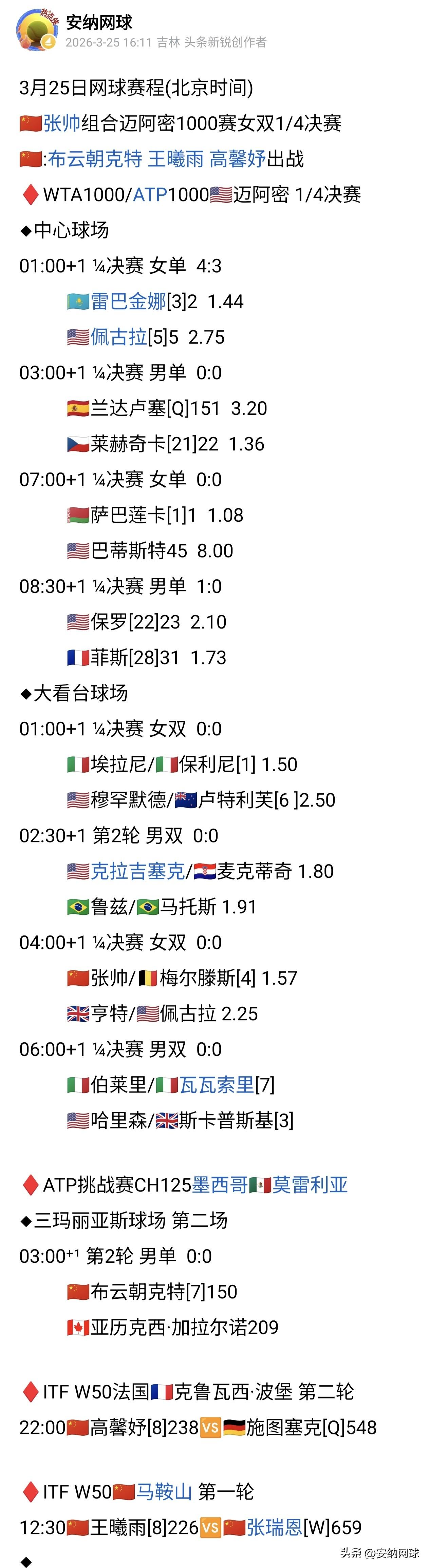 3月25日网球赛程(北京时间) 🇨🇳张帅组合迈阿密1000赛女双1/4决赛 🇨🇳:布云朝克特 王曦雨 高馨妤出战 ♦WTA1000/ATP1000🇺🇸迈阿密 1/4决赛 ◆中心球场 01:00+1 ¼决赛 女单 4:3 🇰🇿雷巴金娜[3]2 1.44 🇺🇸佩古拉[5]5 2.75 03:00+1 ¼决赛 男单 0:0 🇪🇸兰达卢塞[Q]151 3.20 🇨🇿莱赫奇卡[21]22 1.36 07:00+1 ¼决赛 女单 0:0 🇧🇾萨巴莲卡[1]1 1.08 🇺🇸巴蒂斯特45 8.00 08:30+1 ¼决赛 男单 1:0 🇺🇸保罗[22]23 2.10 🇫🇷菲斯[28]31 1.73 ◆大看台球场 01:00+1 ¼决赛 女双 0:0 🇮🇹埃拉尼/🇮🇹保利尼[1] 1.50 🇺🇸穆罕默德/🇳🇿卢特利芙[6 ]2.50 02:30+1 第2轮 男双 0:0 🇺🇸克拉吉塞克/🇭🇷麦克蒂奇 1.80 🇧🇷鲁兹/🇧🇷马托斯 1.91 04:00+1 ¼决赛 女双 0:0 🇨🇳张帅/🇧🇪梅尔滕斯[4] 1.57 🇬🇧亨特/🇺🇸佩古拉 2.25 06:00+1 ¼决赛 男双 0:0 🇮🇹伯莱里/🇮🇹瓦瓦索里[7] 🇺🇸哈里森/🇬🇧斯卡普斯基[3] ♦ATP挑战赛CH125墨西哥🇲🇽莫雷利亚 ◆三玛丽亚斯球场 第二场 03:00⁺¹ 第2轮 男单 0:0 🇨🇳布云朝克特[7]150 🇨🇦亚历克西·加拉尔诺209 ♦ITF W50法国🇫🇷克鲁瓦西·波堡 第二轮 22:00🇨🇳高馨妤[8]238🆚🇩🇪施图塞克[Q]548 ♦ITF W50🇨🇳马鞍山 第一轮 12:30🇨🇳王曦雨[8]226🆚🇨🇳张瑞恩[W]659 ◆
