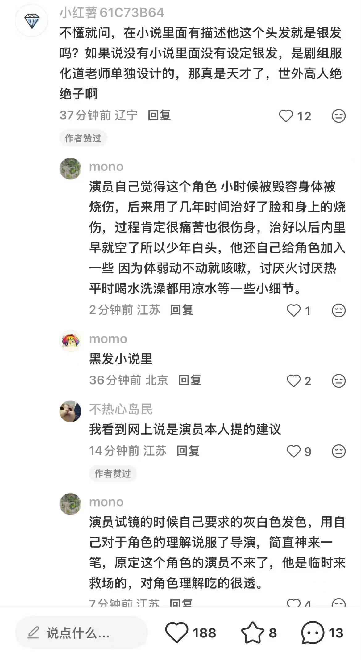 齐旻白发是邓凯要求的齐旻白发是邓凯试镜的时候自己要求的,用自己对于角色的理解说服了导演,简直神来一笔。原定这个角色的演员不来了,邓凯是临时来救场的,但对角色理解却很透彻,机会是留给有准备的人的。果然演员比观众先理解角色爱上角色才能真正演好角色,齐旻的破圈是必然的!