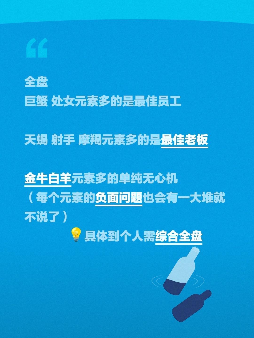 全盘 巨蟹 处女元素多的是最佳员工 天蝎 射手 摩羯元素多的是最佳老板 金牛白羊元素多的单纯无心机 (每个元素的负面问题也会有一大堆就不说了) 💡具体到个人需综合全盘