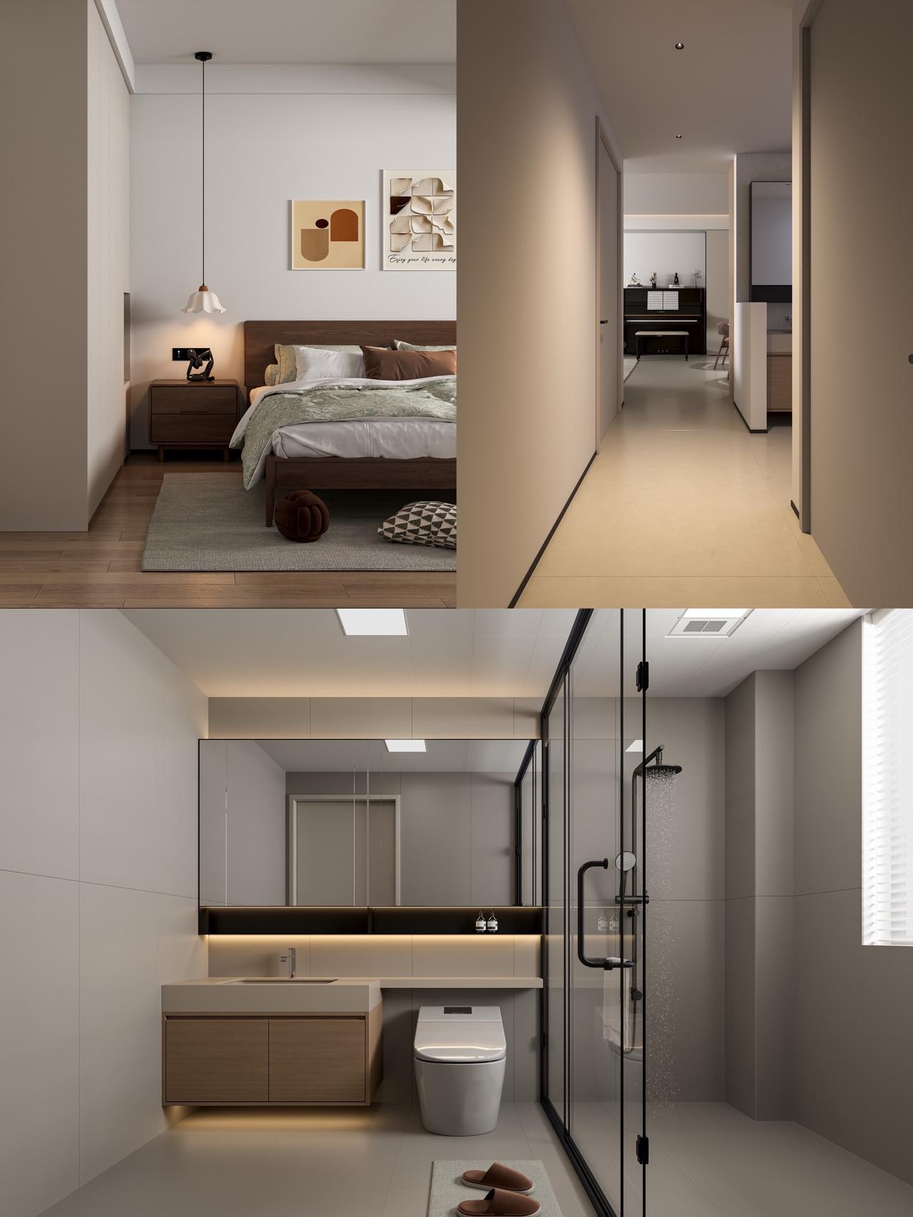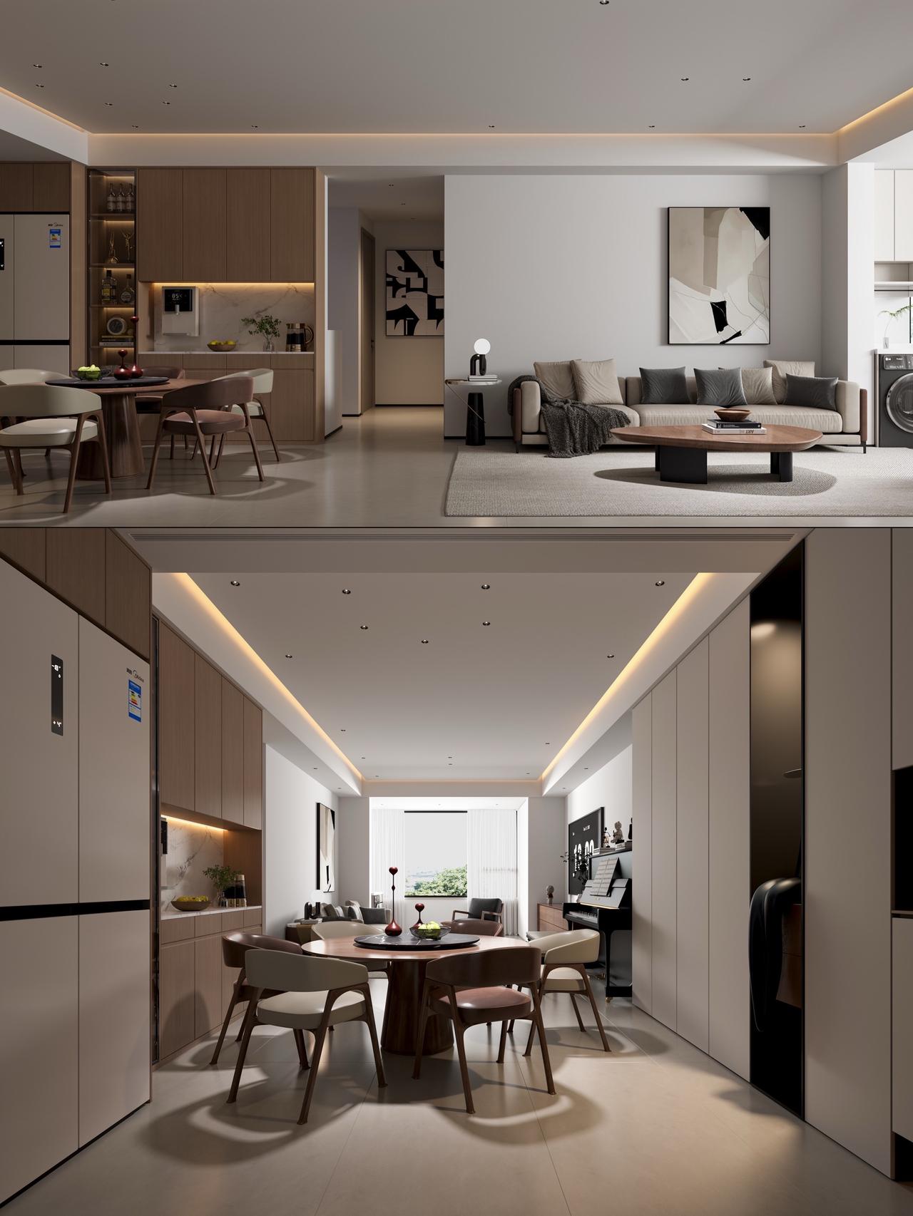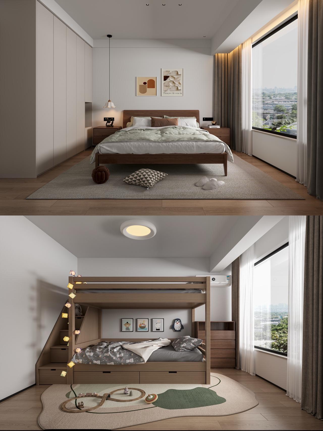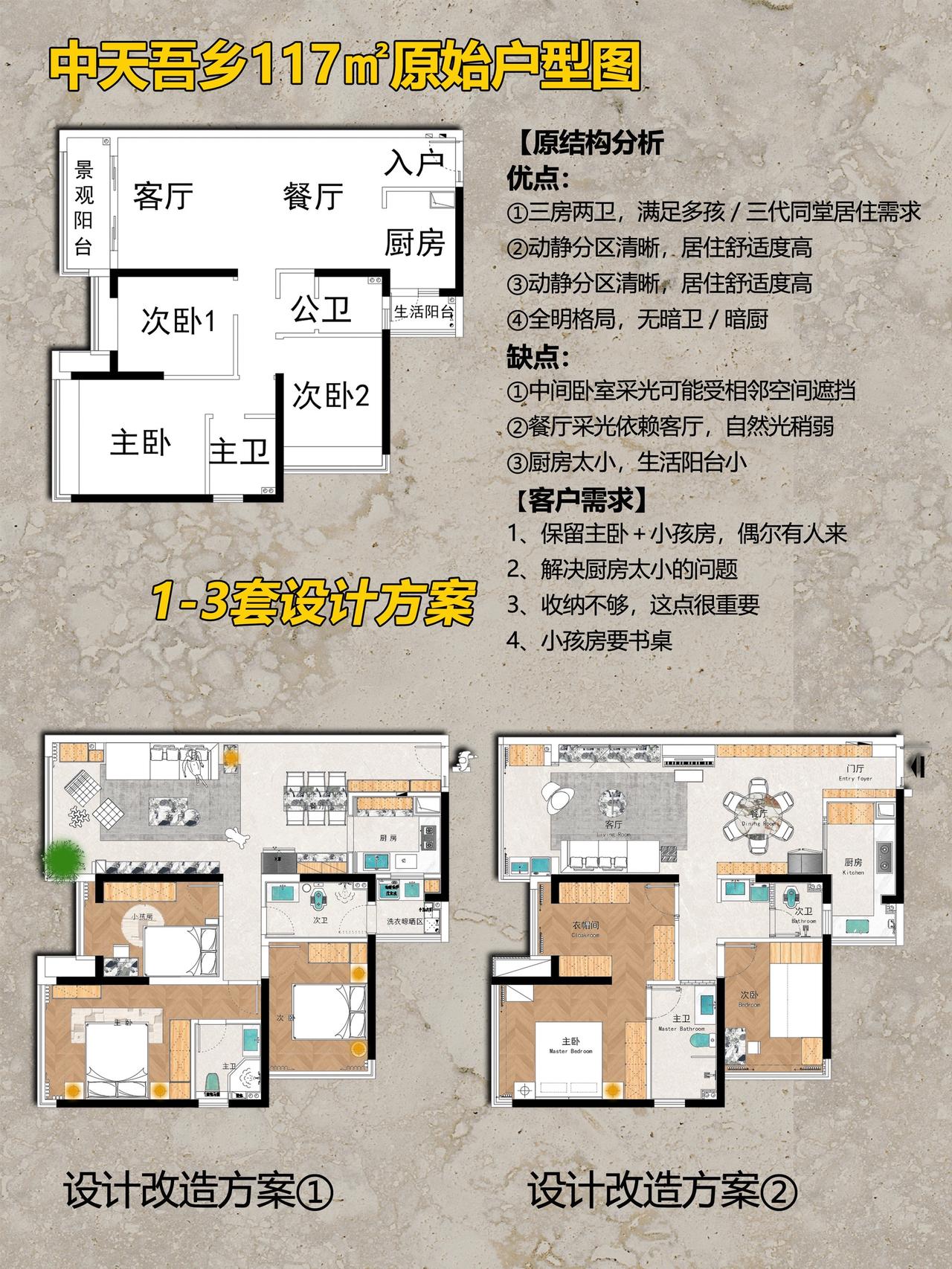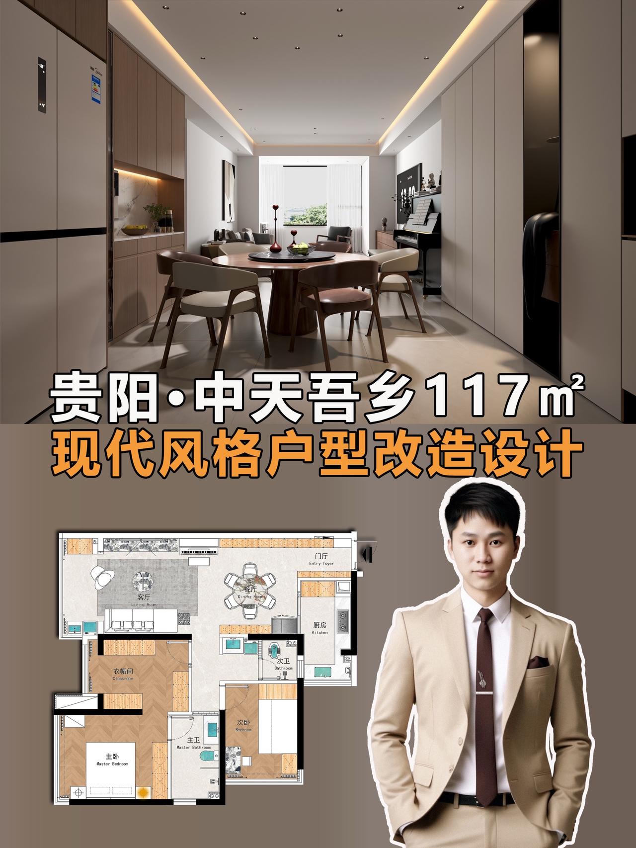 贵阳中天吾乡117㎡现代风户型改造设计!本方案基于贵阳中天吾乡117㎡原始户型,结合业主核心需求,通过空间重构、收纳优化、风格统一,打造现代简约风宜居空间。方案②为最终落地效果,兼顾功能、品质与收纳,适配三口之家居住需求。 项目基础信息 📍楼盘:贵阳中天吾乡 🏠户型:平层(三室两厅一厨两卫) 📏面积:117㎡ 🎨风格:现代风格 核心需求: 1. 保留主卧+小孩房,兼顾偶尔来客居住 2. 解决原始厨房、生活阳台空间过小的问题 3. 大幅提升全屋收纳能力 4. 小孩房预留书桌学习区 原始户型优劣势: ✅ 优点:三房两卫满足多孩/三代同堂;动静分区清晰;全明格局无暗厨暗卫 ❌ 缺点:中间次卧采光受遮挡;餐厅依赖客厅采光;厨房、生活阳台空间局促 两套改造方案对比 方案①:三房保留型(适配多孩家庭) 改造核心:保留3个完整卧室,优化空间利用率 关键调整: 1. 厨房扩容:整合部分生活阳台空间,扩大操作台面,解决储物不足 2. 公卫干湿分离:优化动线,提升使用效率 3. 小孩房定制:预留书桌+衣柜一体化设计,满足学习与收纳 4. 全屋收纳:客餐厅、卧室定制通顶柜,补充储物空间 • 适配人群:多孩家庭、三代同堂,需要完整3个卧室的家庭 方案②:两房升级型(适配三口之家,方案②效果图对应) 改造核心:将次卧1改造为独立衣帽间,升级主卧套间,提升居住品质 关键调整: 1. 空间重构:打通次卧1,打造步入式衣帽间,主卧形成「卧室+衣帽间+主卫」套间 2. 客餐厅一体化:扩大公共区域,打造大横厅,提升采光与通透感 3. 厨房优化:整合生活阳台,打造U型厨房,解决空间过小问题 4. 全屋收纳:入户通顶柜、餐边柜、衣帽间、卧室柜,实现收纳最大化 5. 功能升级:客餐厅预留钢琴区,满足业主兴趣需求 适配人群:三口之家、偶尔来客,追求居住品质与收纳的家庭 方案②空间效果解析(最终落地效果) 客餐厅空间设计亮点: 1. 客餐厅一体化,无多余隔断,空间通透感拉满 2. 入户通顶高柜+餐边柜,解决入户收纳与餐厅储物 3. 无主灯设计+线性氛围灯,提升空间层次感 4. 客餐厅预留钢琴区,兼顾功能与兴趣 5. 原木+浅灰配色,现代简约,温馨大气 材质选择:大尺寸柔光地砖、木作柜体、乳胶漆墙面 主卧套间设计亮点: 1. 独立步入式衣帽间,满足衣物、饰品收纳 2. 卧室通顶衣柜,补充储物,视觉整洁 3. 主卫干湿分离,玻璃隔断+智能马桶,提升使用体验 4. 大面落地窗,采光充足,视野开阔 风格统一:延续客餐厅原木+浅灰配色,温馨舒适 小孩房设计亮点: 1. 定制高低床+楼梯柜,最大化利用空间,满足成长需求 2. 预留书桌学习区,满足孩子学习需求 3. 通顶储物柜,解决玩具、衣物收纳 4. 大面落地窗,保证采光,视野开阔 设计细节:童趣软装搭配,兼顾实用性与趣味性 公卫设计亮点: 1. 干湿分离设计,玻璃隔断,提升使用效率 2. 通顶镜柜+洗手台柜,解决卫浴用品收纳 3. 浅灰瓷砖+木作柜体,现代简约,易清洁 📄【以往案例】 中铁阅花溪|中铁逸都|中铁阅山湖|阅山湖云著|华润悦府|中海映山湖|茅台广场|美的林城|金融城|融创九樾府|中海印龙泉|华润九悦|龙湖天曜|龙湖湖山原著|万科鸣翠|万科麓山|铁建城|龙湖舜山府|远大美域|观山小区|建发和玺|保利公园 。。。。。。 贵阳装修 中天吾乡 现代风格 装修