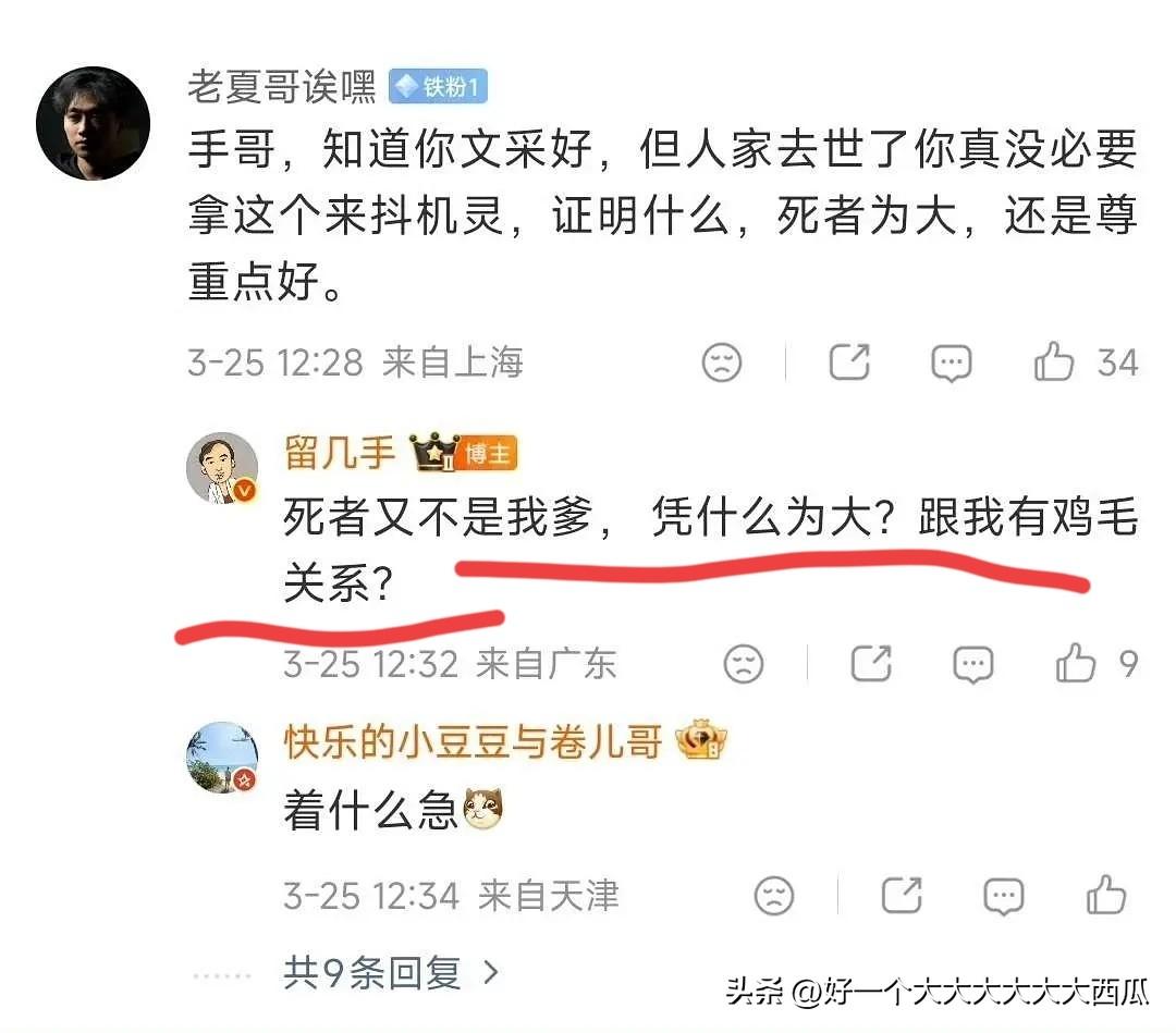 留几手这人能够吃到网络流量你我都有责任, 都说死者为大, 可这货居然在公共社交媒体账号上发这样的言论, 而且他故意不点名道姓, 因为一旦有人说他意有所指, 他还可以狡辩出无数种理由表明他说的不是大家想的那样。