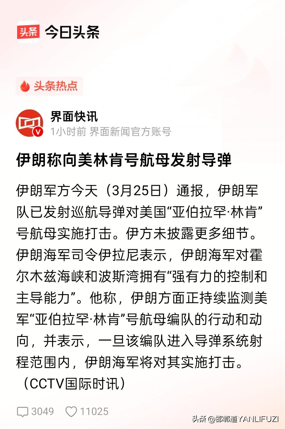 别嘲笑伊朗了,它虽是小国,对抗霸权的表现已相当出色。现在,对准亚伯拉罕林肯号航母战斗群。这不只是有没胆量的问题。 美以伊较量近三周,美国像踩进沼泽地。 美国目标众多,想换伊朗领导层、炸核设施等,结果却不尽如人意。 伊朗政权稳如泰山,还不断向美军基地发射导弹。 美国不仅要自己护航霍尔木兹海峡,还搭进去一堆“附加成本”,油价上涨、防空导弹不够用,老特支持率下降。 伊朗敢直接反击美军相关目标,这不是冲动,而是绝境下的自卫。 它既表明态度,又守住底线,这种清醒和克制,真是值得敬佩。