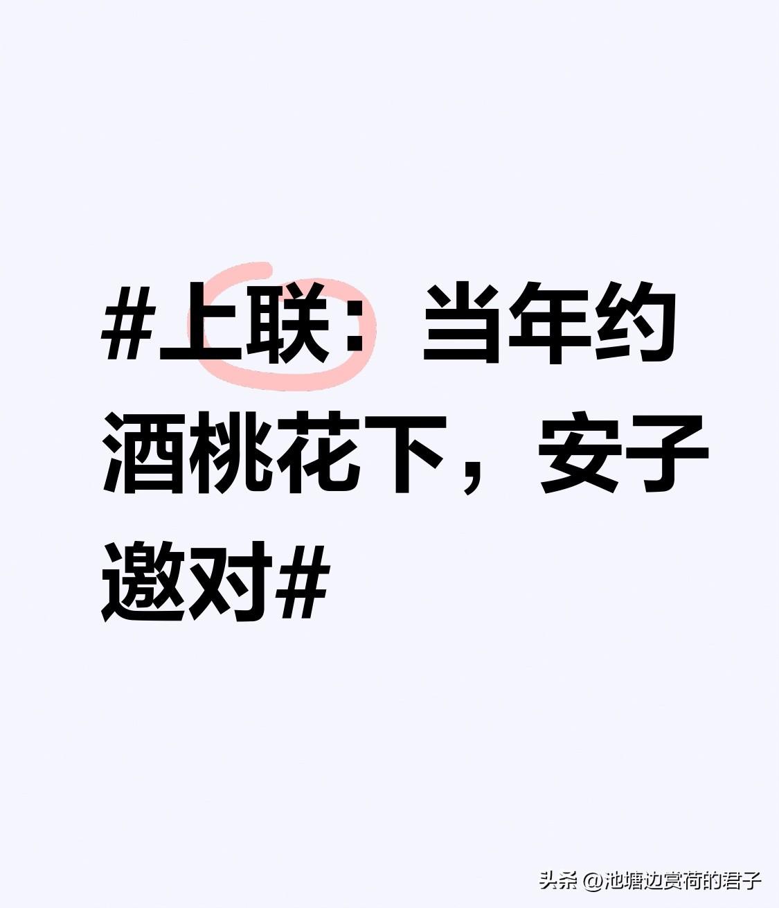 看到这个上联“当年约酒桃花下”,瞬间就有画面感了,仿佛能看到当年在桃花纷纷扬扬飘落的树下,几人相约把酒言欢的惬意场景。我来对个下联“此际吟诗柳树边”。 “此际”对应“当年”,都是时间概念;“吟诗”和“约酒”都是风雅之事;“柳树边”与“桃花下”对仗工整,且柳树边也是个很有意境的地方,能想象出现在柳树旁微风拂动柳枝,有人在那吟诗抒怀,和上联的氛围相得益彰,你们觉得我对得咋样?
