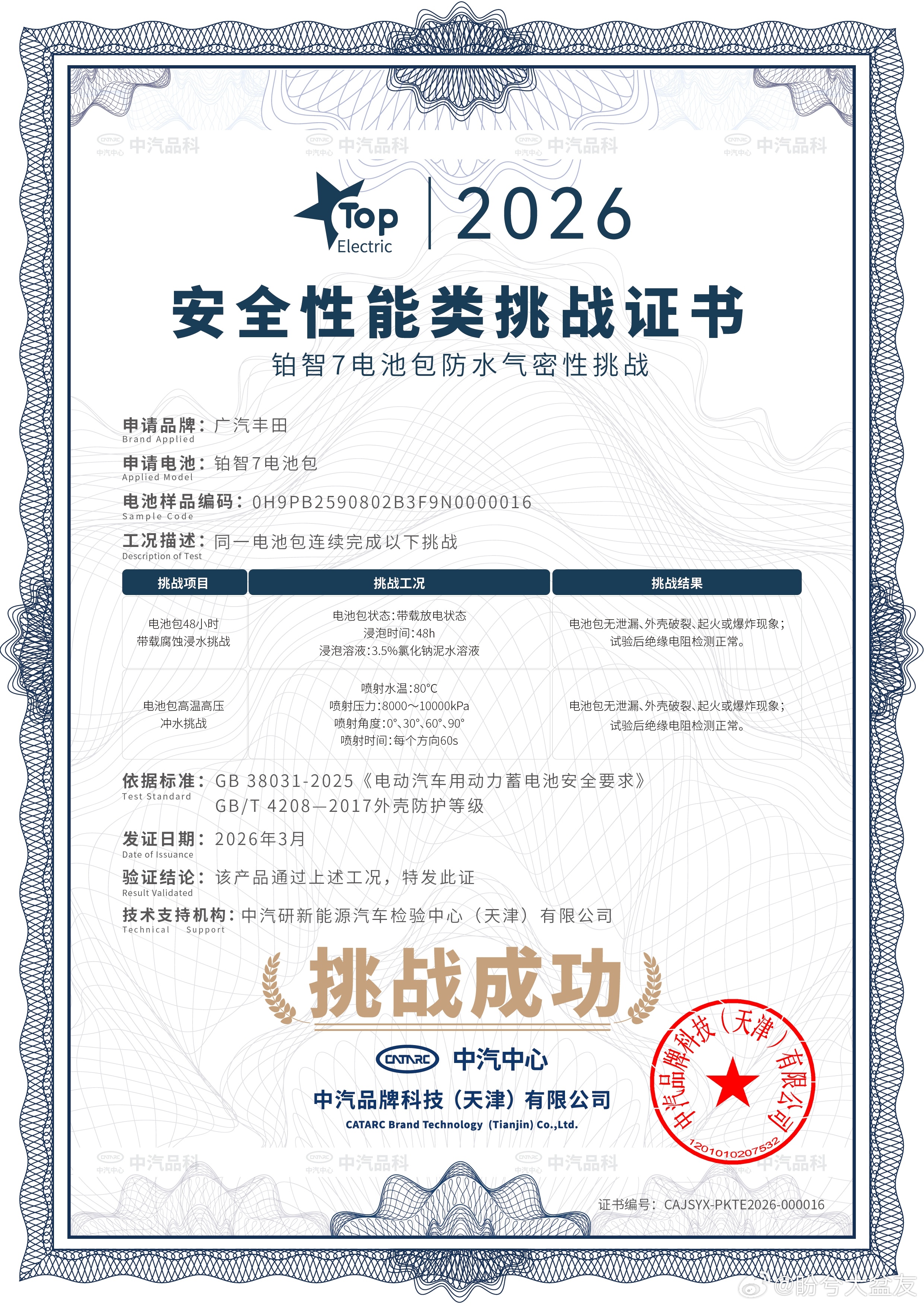最硬核的电芯切割,全新电芯和等效30万公里的老电芯切开后温度正常,静置24小时都不起火,完美模拟碰撞电芯受损的极端情况。还有48小时腐蚀浸水、双重刮底侧碰、高压冲水等严苛考验,电池防护与整车安全全程在线,把电车安全讲得很具体。这也难怪广汽丰田敢给出自燃、智能泊车事故、电池衰减三担责的承诺。安全实力看得见,3月29日正式价格发布会,狠狠期待最终定价!丰田铂智7电芯全切24小时不起火丰田铂智7电池扛住切泡冲撞极限测试丰田铂智7定档3月29日上市