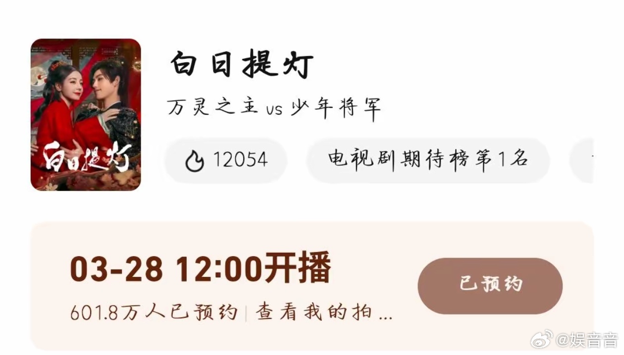 白日提灯2026年度待播剧集预约TOP1白日提灯 疯狂为《白日提灯》的预约成绩欢呼🥳!成为2026年度待播剧集预约TOP1,这热度简直无人能敌。贺思慕四百岁灵主的独特魅力,段胥神秘少年将军的迷人风采,再加上迪丽热巴和陈飞宇,0328必须守在屏幕前!