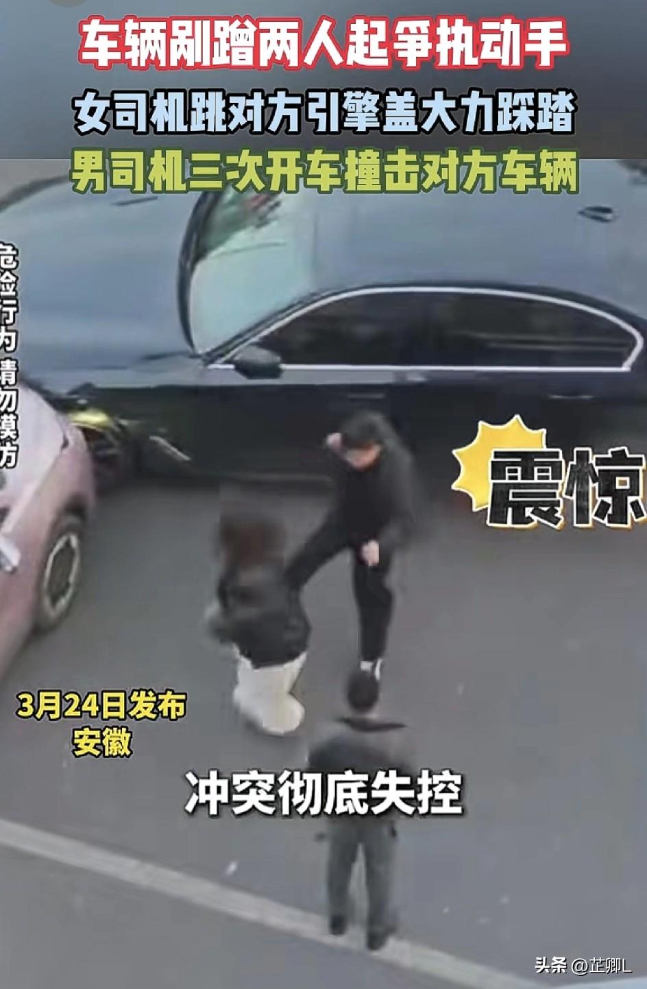 小区门口上演全武行!剐蹭变惊天大战!粉车女猛踩引擎盖、踢掉后视镜,黑车男怒气上头驾车狂撞?! 近日,安徽宁国某小区门口,上演了一出比电视剧还刺激的“动作大片”! 3月24日下午两点多,一辆粉色的新能源车和一辆黑色的宝马,在路口蹭到一块儿了。 其实本来就是点小刮小蹭,多大点事儿啊,走保险或者好好商量,事儿不就解决了? 可偏偏这两位脾气都“火爆”! 先是粉车的女司机,直接一脚踏上了宝马的引擎盖,那是一顿猛踹猛踩啊。 这下宝马男司机心疼坏了!哪受得了这个,冲上去把她硬拽下来,两人当场扭打在一起,扇巴掌、踢腿,动作那叫一个大! 中间被路人劝开了,以为就此结束了。 结果呢?粉车女趁男司机上车不备,上去“哐当”一脚,直接把宝马车的后视镜给踢废了! 这一脚彻底点燃了炸药桶!宝马男估计也上头了,不管不顾了,直接油门一踩,对着粉车就一顿猛撞!那是真撞啊,听着都脆生! 幸好周围路人及时拦住,才没闹出更严重的后果来。 唉,本来就是个交通事故,现在好了,两败俱伤!车子撞得稀巴烂,人还得进局子接受调查。为了争那一口气,把小事闹大,这到底图啥呢? 路上遇到事儿,千万别上头!退一步海阔天空,千万别让情绪失控,不然最后吃亏的,肯定是自己! 素材来源:纵深新闻,侵联删!