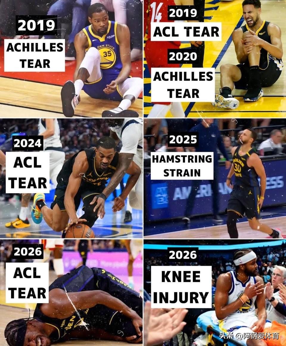 美媒thrillbasket总结勇士这些年遇到的伤病: 凯文-杜兰特 —— 跟腱撕裂(2019年) 克莱-汤普森 —— 前交叉韧带(ACL 2019年) 克莱-汤普森 —— 跟腱撕裂(2020年) 梅尔顿 —— 前交叉韧带(ACL 2024年) 斯蒂芬-库里 —— 腿筋拉伤(2025年) 吉米-巴特勒 —— 前交叉韧带(ACL 2026年) 摩西-穆迪 —— 膝伤(2026年) 勇士旧将埃泽利前几日在直播节目中表示: “感觉勇士像是在偿还某种‘因果债'”。 希望受伤的球员早日康复,没伤的球员不要受伤!伤病对于一支球队的打击无疑是巨大的,勇士队这些年频繁遭遇伤病侵袭,着实令人唏嘘。从杜兰特那令人痛心的跟腱撕裂,到克莱两次严重的伤病,每一次都像是一颗巨石投入平静的湖面,激起层层涟漪,影响着球队的走向。 杜兰特的跟腱撕裂,让勇士在2019年的争冠之路上折戟沉沙。他本是球队进攻端的一把利刃,那凌厉的单打和无解的投篮,是对手的噩梦。那次伤病之后,他的状态虽依然出色,但已难回巅峰,也让勇士失去了一位夺冠的关键拼图。 克莱的两次重伤,更是让勇士的外线火力锐减。曾经那个在三分线外弹无虚发的“佛祖”,经历了漫长的康复过程。他的缺阵,让对手在防守时可以将更多的精力放在库里身上,极大地影响了球队的战术体系。 梅尔顿、库里、巴特勒和穆迪等人的伤病,也让球队在不同时期陷入困境。不过,勇士队展现出了顽强的韧性。他们在伤病满营的情况下,依然能凭借着团队的力量和战术的调整,在赛场上拼出自己的一片天地。 埃泽利所说的“因果债”,虽带着一丝玄学色彩,但也反映出了勇士队遭遇伤病的频繁程度。伤病是体育比赛中难以避免的一部分,希望勇士队能尽快走出伤病的阴霾,也如我们所期盼的,受伤的球员能早日康复,没伤的球员远离伤病,在未来的赛场上继续为球迷们带来精彩的比赛。