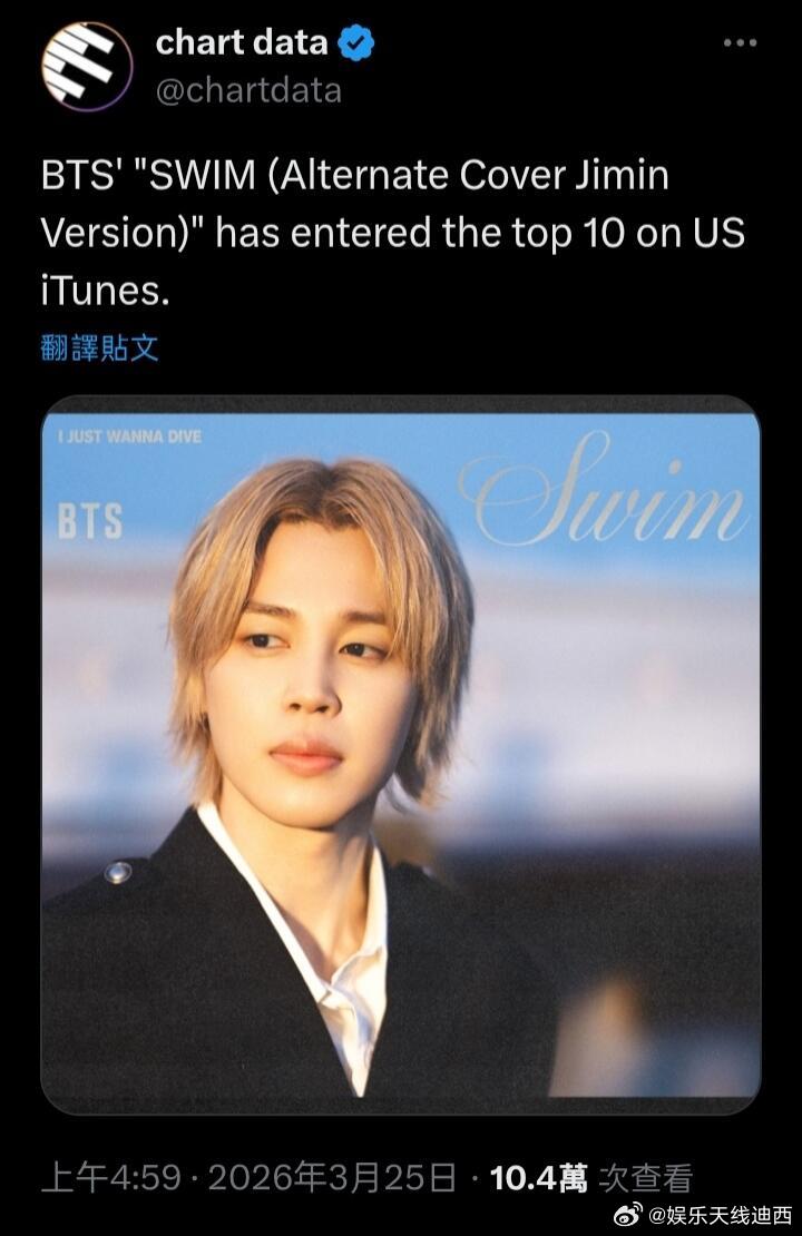 Jimin Version已进美国iTunes前10BTS的《SWIM (Alternate Cover Jimin Version)》已进入美国iTunes 排行榜前十名。欧美top朴智旻