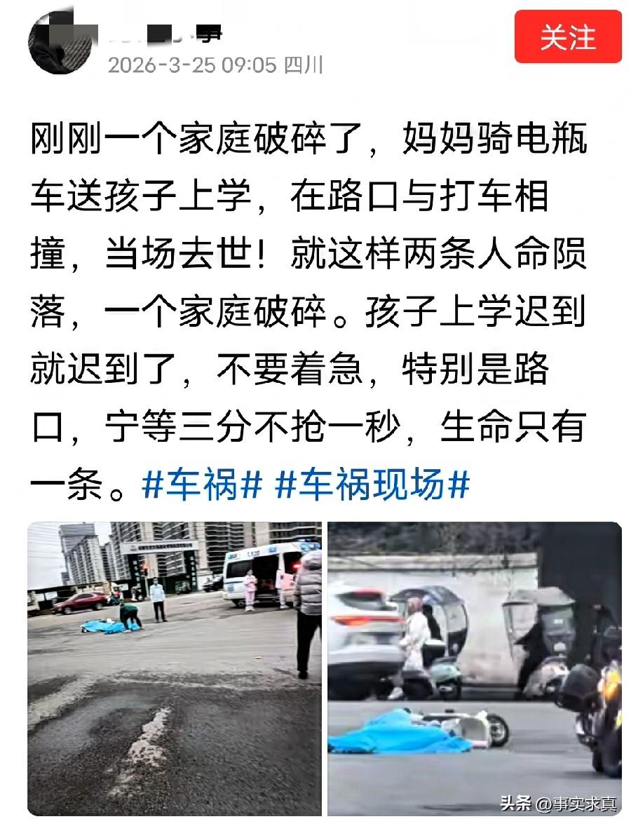 一车两命惨死红灯路口 刚刚看见一个头条新闻,一个妈妈用电动车送孩子上学,在红绿路口与小车相撞,一开始以为没事呢,后来120来了医护人员下车看了一下,直接盖上白布证明已经没救了,奉劝各位送孩子上学家长一定要看清楚再走,不能为了赶时间拿生命赌明天,千万注意安全一切以安全为主,
