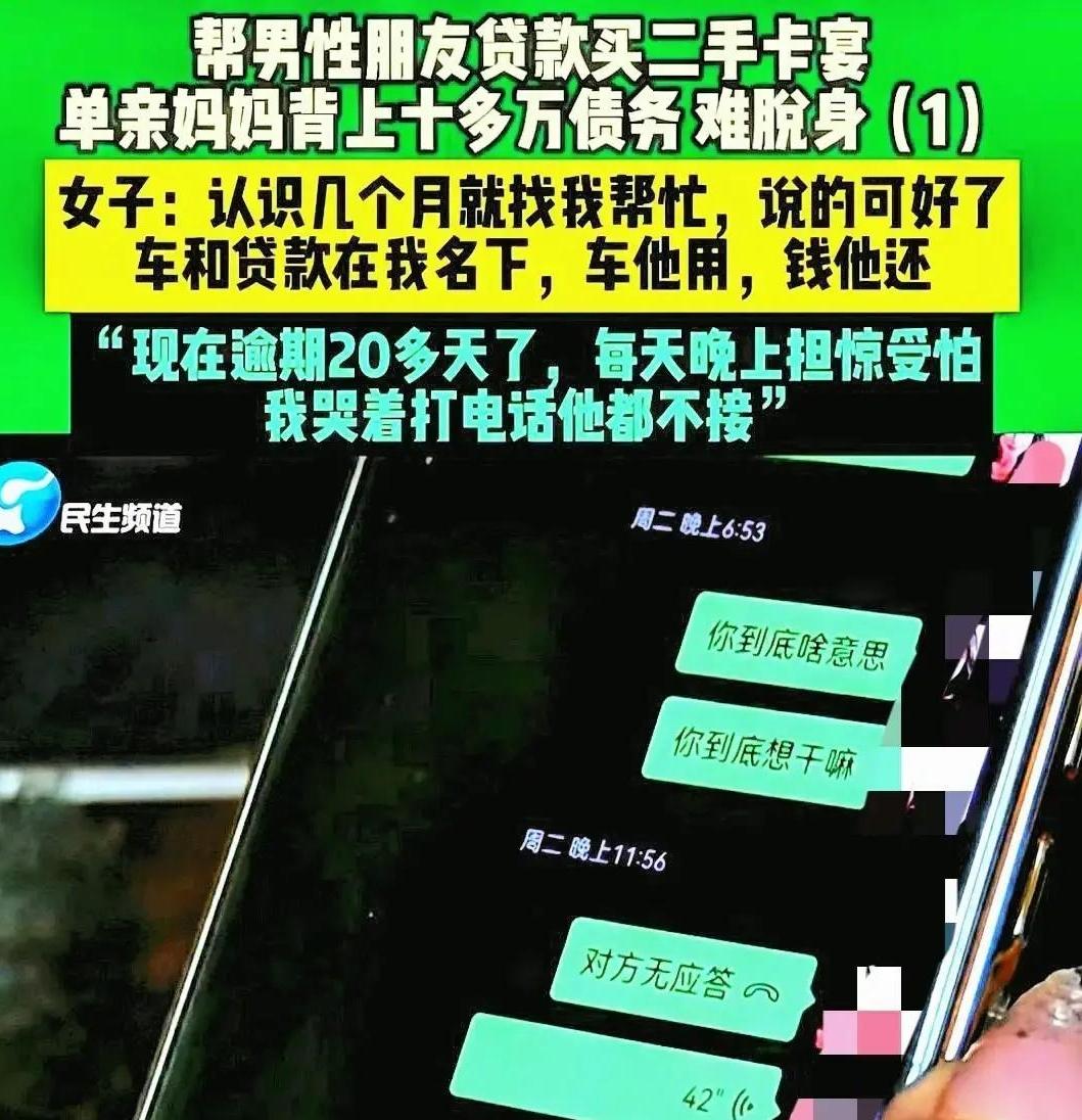 单亲宝妈为男友贷款10万买车,可万万没想到!男友突然失联,车已过户他人! 2023年,郑州芳女士认识了男友王某,几个月后,她就用自己的名字去贷了十多万,买下一辆保时捷卡宴,交给男友来开,男友王某一开始还都按时还款,这让芳女士感觉自己找的男友挺靠谱。 可一年后,芳女士傻眼了!男友突然失踪可,联系不上了,最后电话也被拉黑,发微信也不回应,更让芳女士气愤的是,她发现那辆车不知什么时候已经过户到了别人名下,而且所有欠款都还在她这边,银行天天不停的催她还款。 她当一开始觉得王某挺会照顾和关心别人,于是就放下了防备心,可现在孩子还很小,她自己赚的钱又不多,每个月的贷款让她难以承受,日子过得很是挺煎熬!
