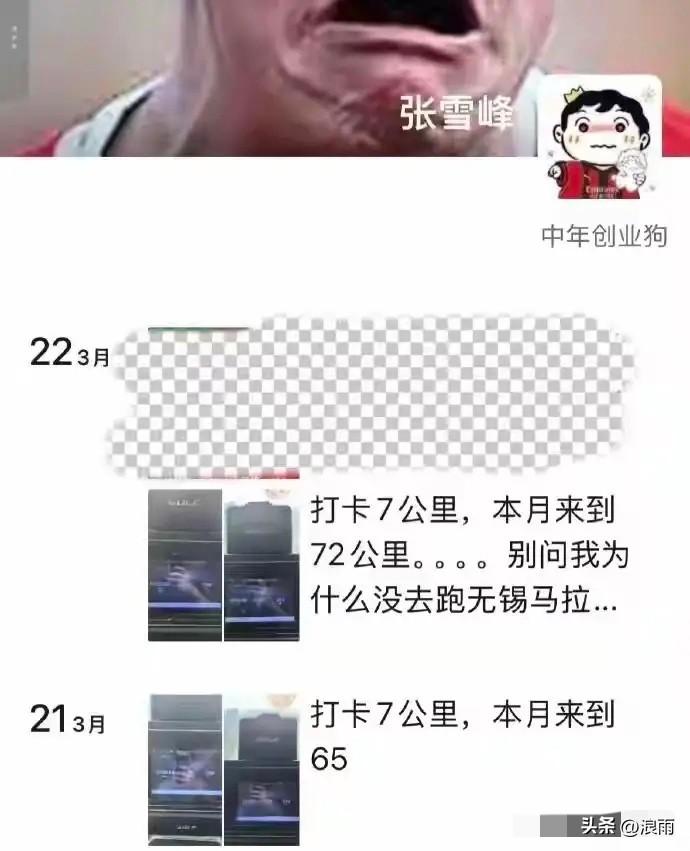 出事的时候张雪峰就是在这台跑步机上正在跑步。可以发现为了能跑步,他专门隔了这间屋子。每次跑之前都会换上跑步鞋,穿上运动套装。 跑步机上的他一脸的开心,看得出来他确实很享受这个过程。 他的朋友圈动态显示他每次跑7公里,跑完步他都会打卡记录。 3月24日,中午吃完饭的他,换上装备,像往常一样开始跑步,却出现意外,倒在了跑步机上。 如果把这台跑步机换成一张床,每次吃完后,躺在这里午休一会儿,会不会是不一样的结局呢?