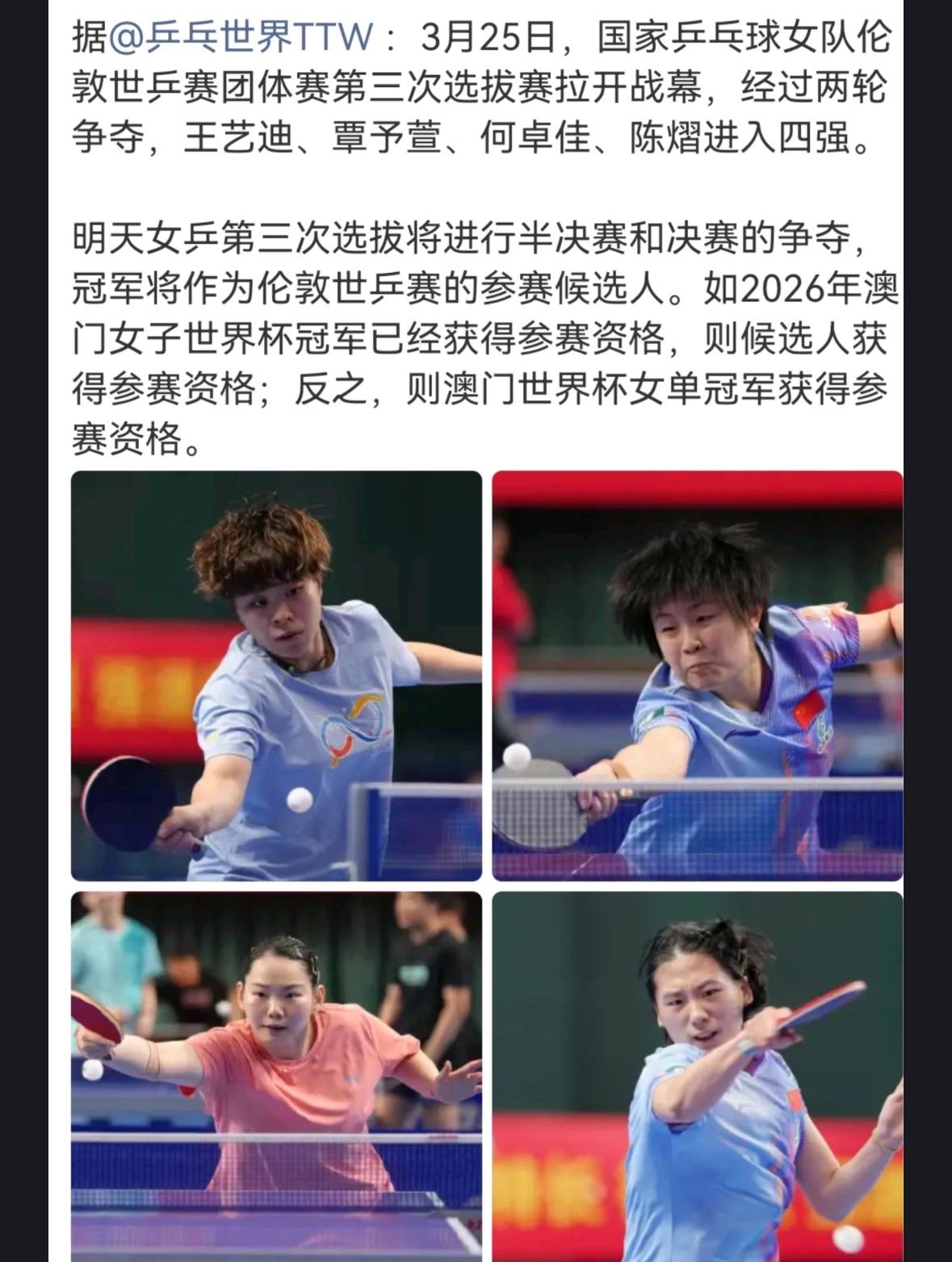 没想到啊,向鹏3:1温瑞博直通伦敦世乒赛参赛名额—向鹏释怀了! 没想到梁靖崑竟然输黄友政, 梁靖崑可是团体赛的魂啊, 希望梁靖崑可以经过教练组评估 进入伦敦世乒赛参赛资格! 女队方面, 王艺迪,陈熠,何卓佳,覃予宣 争夺世乒赛最后一个名额! 女线方面还有一个重要因素, 就是看这次世界杯谁能夺冠, 如果大迪,陈熠,覃予宣, 中谁夺冠,谁就是最后那个世乒赛参赛选手! 加油大迪, 加油陈熠,加油国乒小将! 恭喜向鹏!