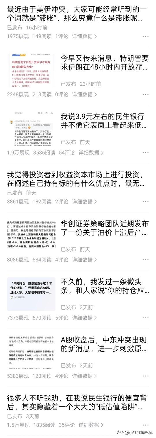 看到张雪峰老师的离去,我其实挺唏嘘的。 一方面觉得自己也在繁忙和高压的环境中工作,身体可能也承受了太多压力。另一方面自己也有一些纠结和自我怀疑:在某条平台看了太多低质量的内容,既觉得自己的坚持创作和内容输出是有意义的,但是看看自己内容的展现量及垃圾内容的展现量,又自我怀疑这样做是不是值得?! 拿前两天我一段时期内的一些内容来举个例:截图时间段内的8条微头条可以明显看到,只要提到银行,提到民生银行,给的展现量就是其他内容的4~5倍。难道是其他内容质量不高吗?肯定不是,其他内容有说宏观经济的,有科普滞胀,谈油价美债的,谈霍尔木兹的,还有带大家回头审视持仓要符合时代背景的。但统统这些都比不过你开口提一句银行,提一句民生。更比不过我今天说的一个垃圾账号,这个账号今天还没结束就已经发了10条关于张半仙的微头条,其中随便一条才发布一个多小时,给的流量就数倍于真正的财经金融内容。其中原因我此前就给大家分析过,平台只看流量,银行股的持股人数多,搜索量大,张半仙也是当下的流量风口。 面对这样的情况,继续占用自己的时间,耗费自己的身体,还值得吗?我在思考这样的问题。