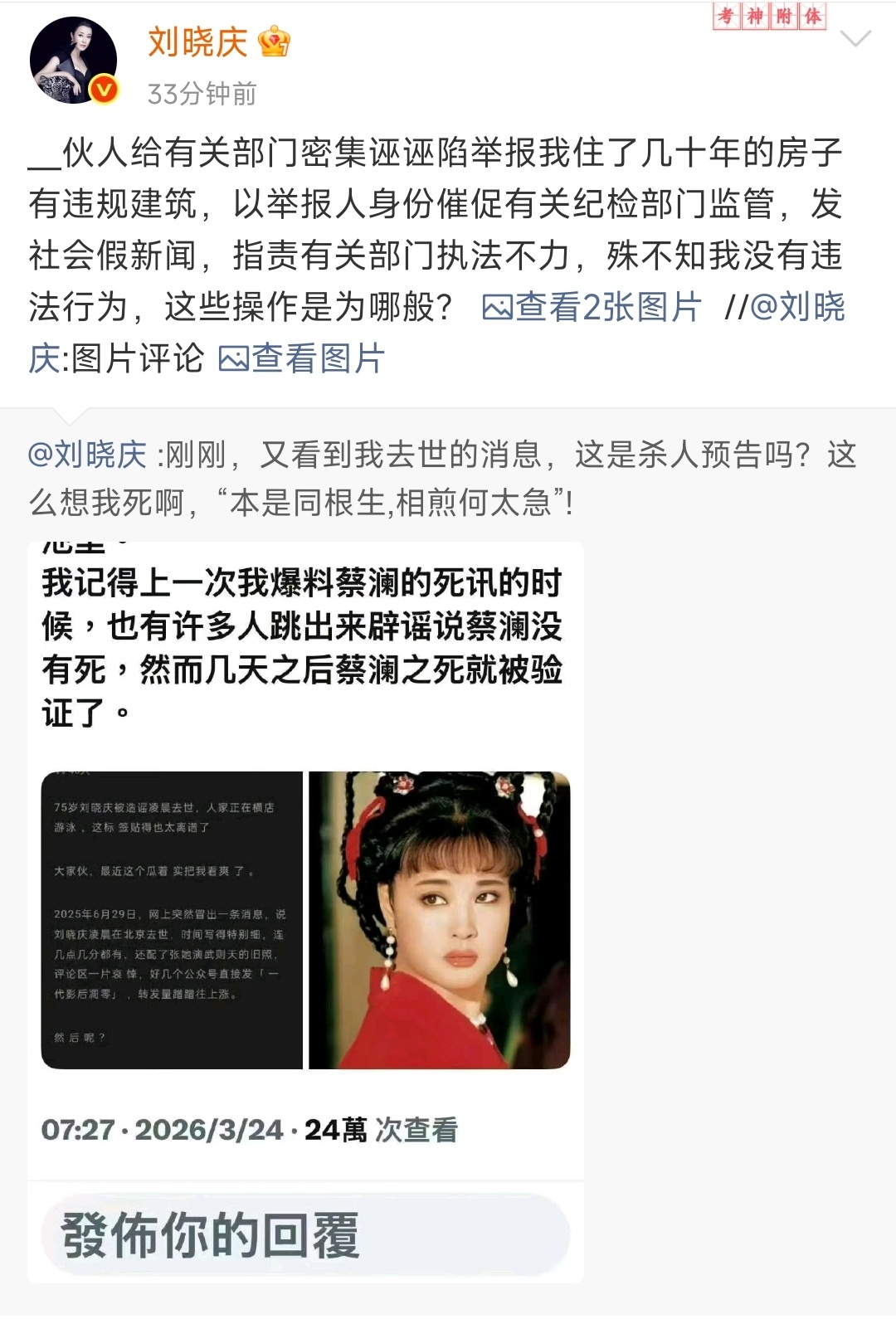 被刘晓庆外甥气到了!75 岁庆奶遭造谣诅咒太离谱75 岁刘晓庆直接炸了!突然被人造谣死在横店泳池,对方还拿蔡澜先生的离世当所谓 “预言”,恶意诅咒活人,简直没底线!