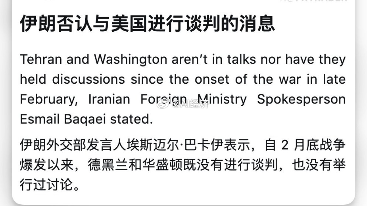 伊朗媒体Fars News报道,伊朗方面表示,伊朗不会接受停火,也不会与违约方进入任何谈判进程,因为与美国谈判不合逻辑。美国确实正在加大努力以促成停火,但伊朗不接受停火,在当前情况下,停火和谈判均不可行。