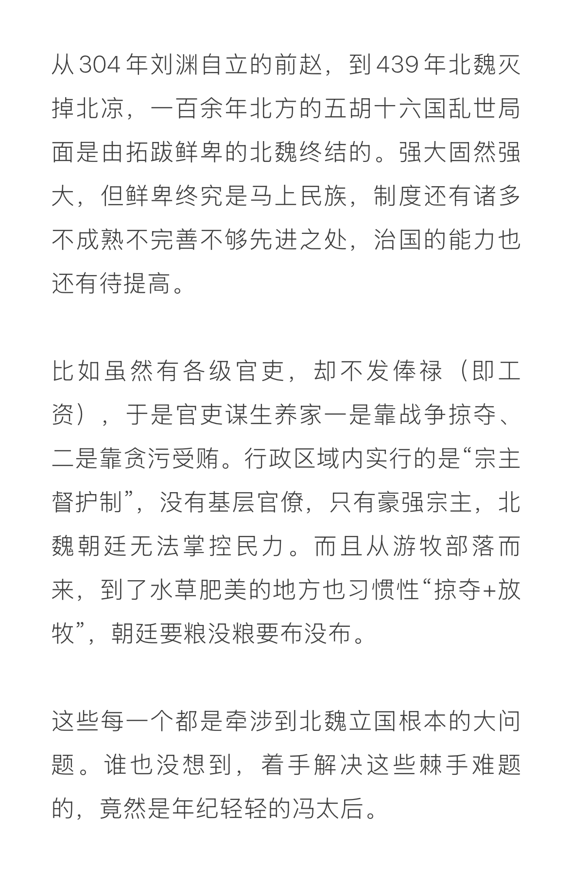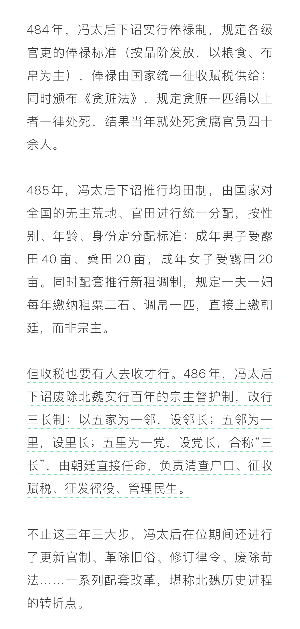 冯太后下诏实行俸禄制、均田制、三长制,更新官制、革除旧俗、修订律令、废除苛法等等一系列配套改革,堪称北魏历史进程的转折点。