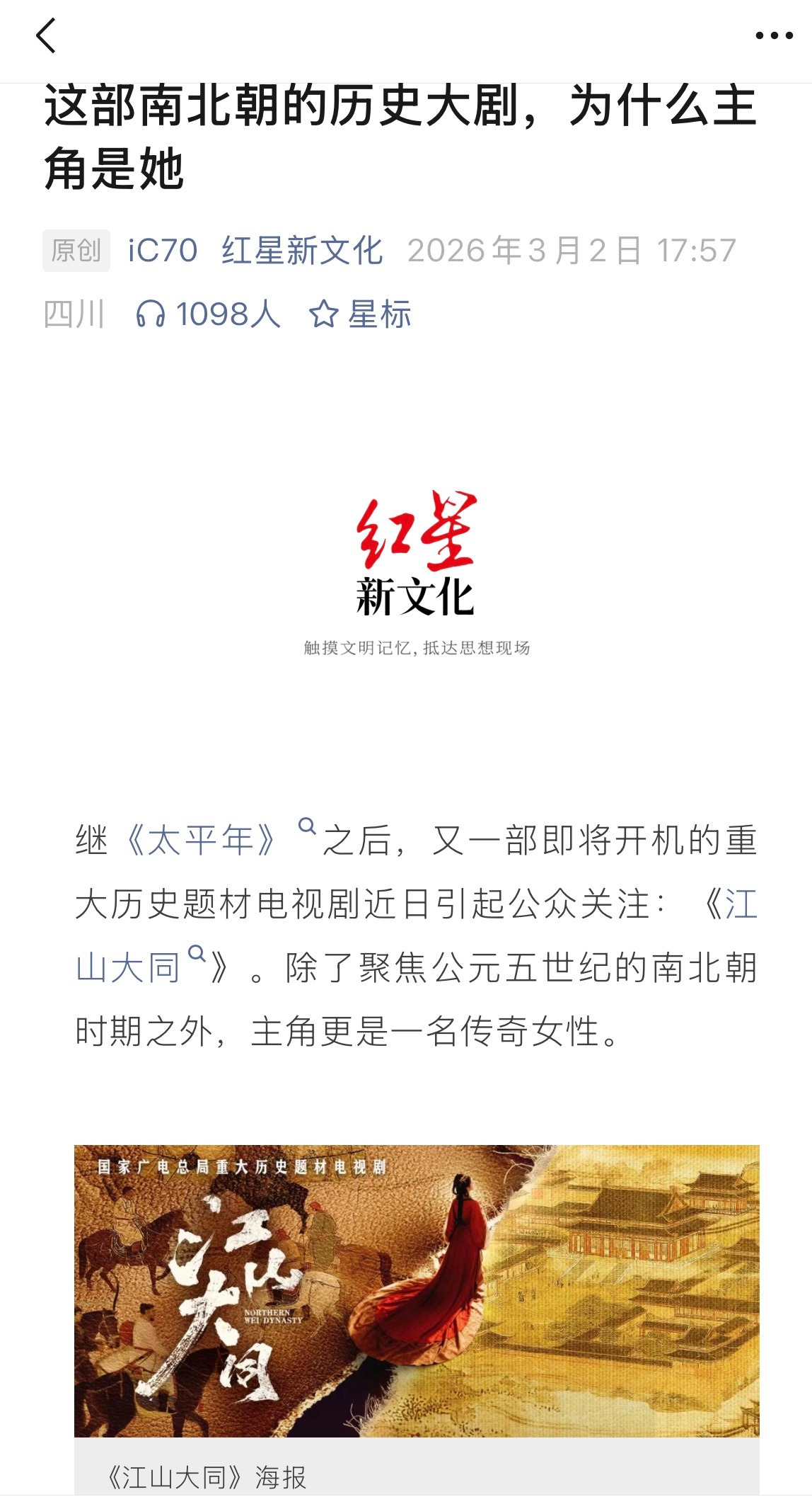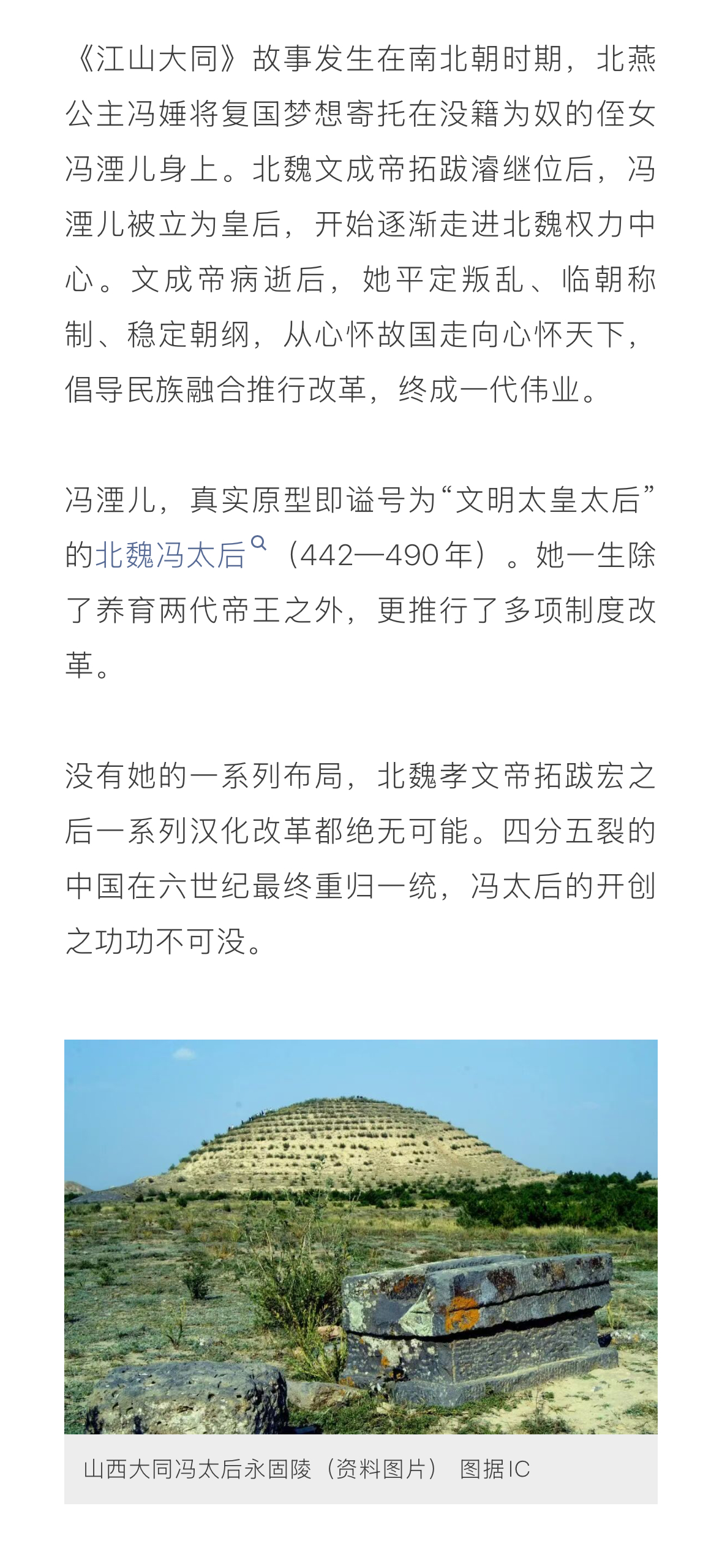 分享一篇科普文章聚焦公元五世纪南北朝时期的历史大剧《江山大同 》,主角是一名传奇女性。