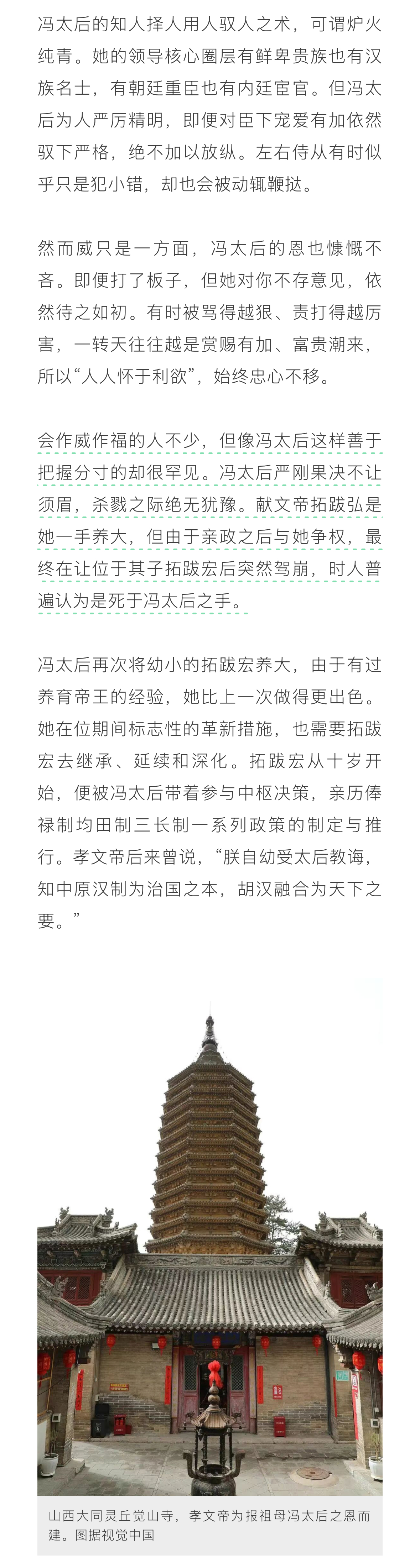 冯太后擅长知人择人用人驭人之术,将“刚柔并济、循序渐进”的政治智慧,深深植入孝文帝之中。冯太后去世后,孝文帝推行了一系列彻底的汉化措施,将冯太后生前的构想更进一层。