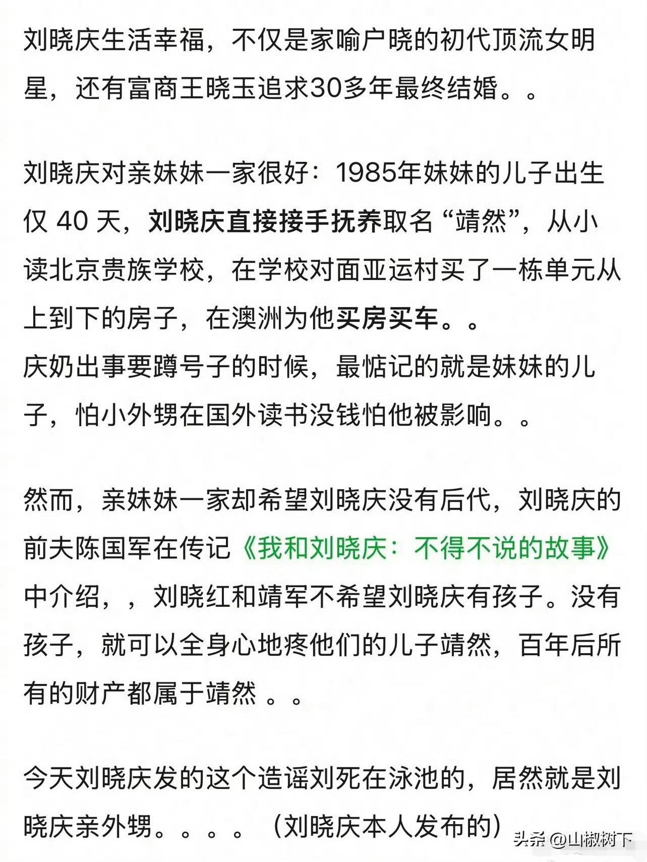 我的天,这不是妥妥的白眼狼吗?那个把外甥当儿子养的刘晓庆居然被背刺了,她抚养了40年的亲外甥靖然,在海外社交平台散布她"死于横店游泳池"的谣言,真是养不熟啊。 要知道这靖然出生仅40多天,就被刘晓庆接到北京抚养,视如己出,承担了全部成长开支,从小读的就是北京贵族学校,并在学校对面购置整栋单元楼方便其上学;留学后全额支付澳洲7年留学费用,为其在当地购房买车,毕业后安排就业,就连妹妹一家都长期居住于刘晓庆北京的别墅,生活开销均由她负担。 她这外甥不仅不感恩,之前还伙同他人举报其北京别墅违建,现在又捏造她死于横店游泳池,这得是多大的仇,多大的恨啊,怪不得刘晓庆要把钱捐了也不给他。