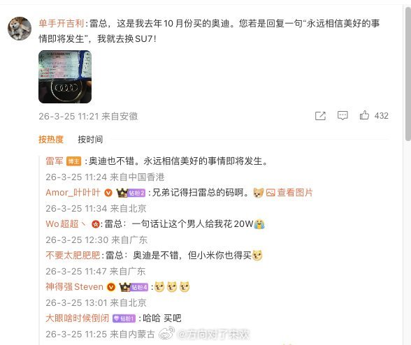 雷军一句话卖出一辆车近日,雷军回复奥迪车主“奥迪也不错,永远相信美好的事情即将发生”,促成对方换购小米SU7。该互动引热议,SU7搜索量暴涨300%,34分钟锁单1.5万台,品牌影响力持续攀升。新能源汽车