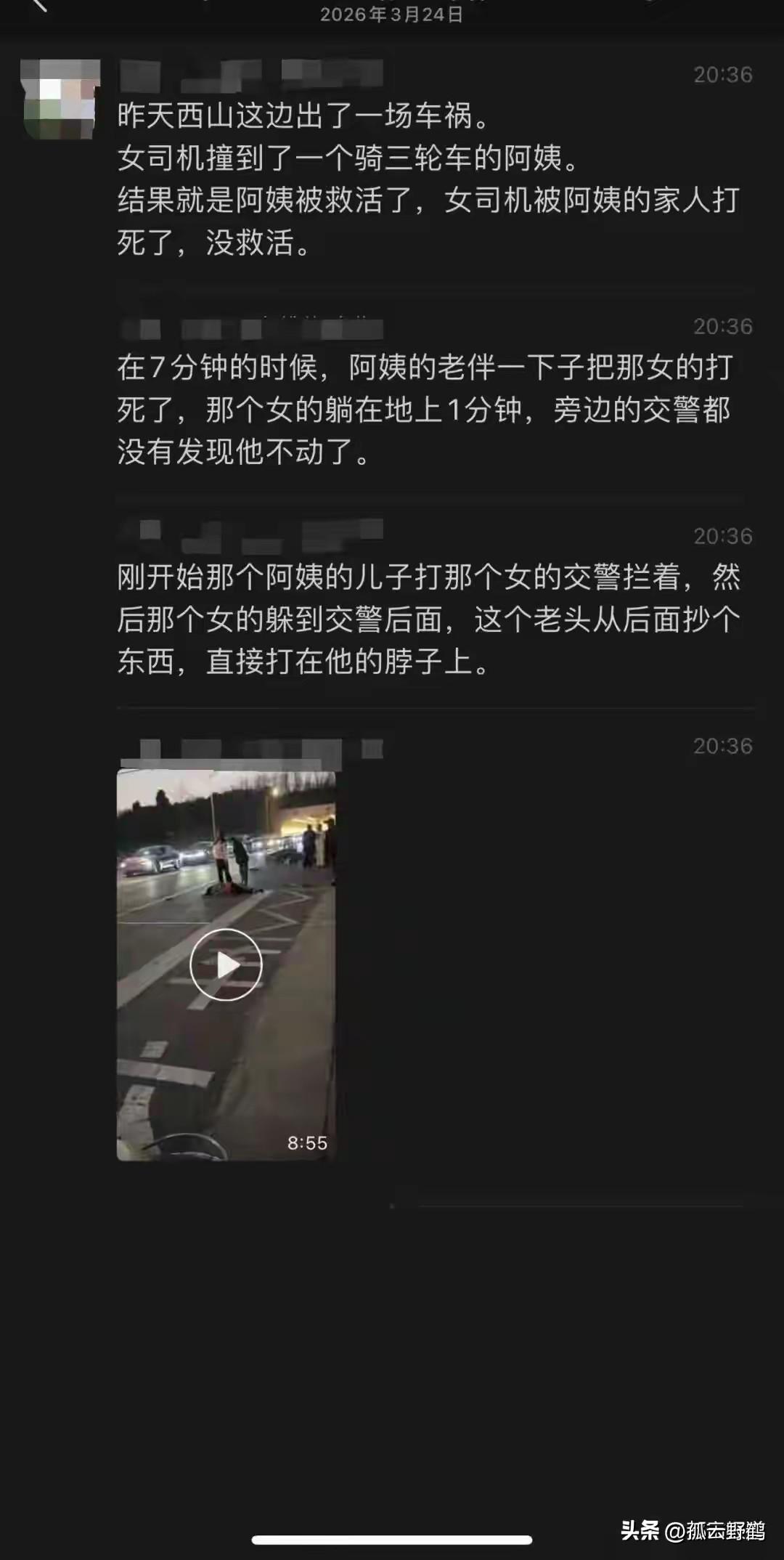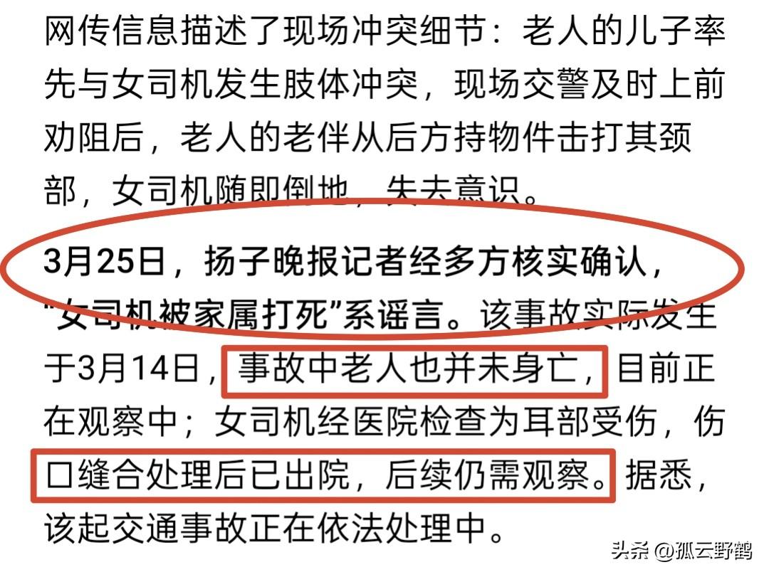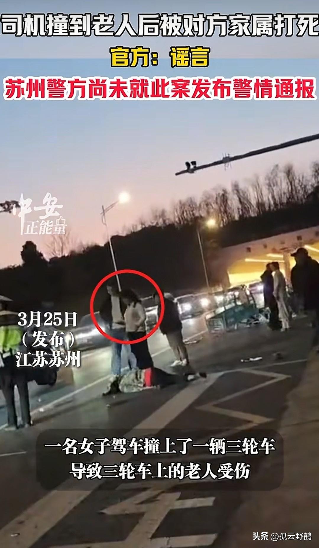 “女司机撞老人后被家属打死”系谣言: 女子已出院,更多细节曝光,警方回应 这件事发生在3月14日晚上8点钟,江苏苏州吴中区西山路段,一女子开车不慎撞上三轮车,导致老太被撞飞在地。 当时,女子就打电话报警以及救护车,甚至等到了老太家属来了,很是负责的告诉对方,是她的责任她会付的。 甚至拦住老太的丈夫不让他去移动老太的身体,以防造成二次伤害。 但老太的丈夫得知是眼前的女子将她老伴撞飞后,连忙捡起地上的东西就去打女司机,还好被民警给当场拦住了。 但是,当老太的儿子赶到现场后,直接乱套了,因为老太的儿子情绪失控了,一直去追着女司机打,大家的注意力都在男子身上,甚至很多人都去拉住他。 结果,被老人钻了空子,只见老人捡起一块比砖头大黑色物件,悄然无声的走到女司机后面,一把抓住她的头发,举起手里的物件砸中了女子耳朵边。 女子当场惨叫一声,捂着耳朵慢慢倒在地上,随后失去了意识。 10天后,也就是3月24日,有网友发布了一段近9分钟的视频,称: “女司机撞老人后,被对方家属打死了!” 随着事件发酵,3月25日,警方回应称: 是谣言,“事故中老人也并未身亡,目前正在观察中。而女司机经医院检查为耳部受伤,伤口缝合处理后已出院”。 对此,有网友说: “一个交通事故,一个是恶意伤人,轻伤直接判刑,绝不私了!”