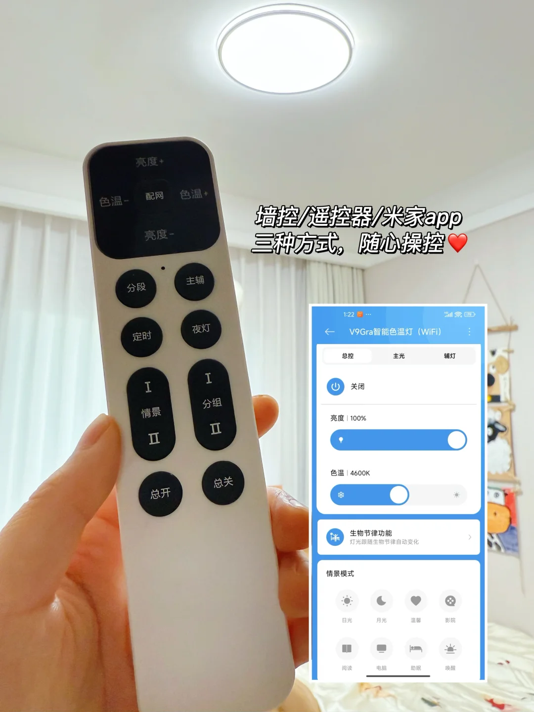 它的颜值和实用性双在线!2.5cm超薄一体灯身,贴顶安装完全不压层高,简约白色灯身低调有质感,和儿童房配一脸。智能调控也超贴心,3000K/4000K/5000K三档色温随心调,睡前读绘本开暖光超温馨,日常玩耍开中性光刚刚好,写作业开冷光视野超清晰,墙控、遥控器+米家APP都能操作,躺床上就能调灯光😜