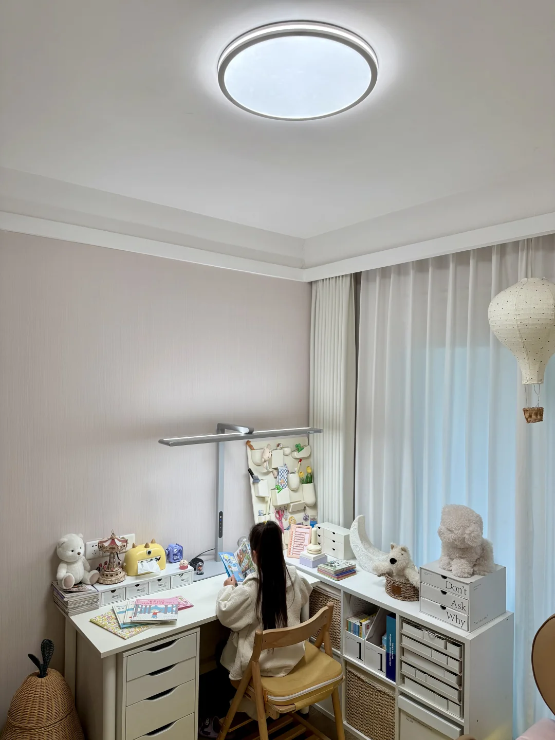 住3楼的痛,懂的都懂😭加之我家儿童房外侧连走廊,天然光线差到离谱,之前的普通吸顶灯开了也只是“勉强亮”,光线不均还刺眼,娃看书写作业总凑很近,老母亲愁坏了👩