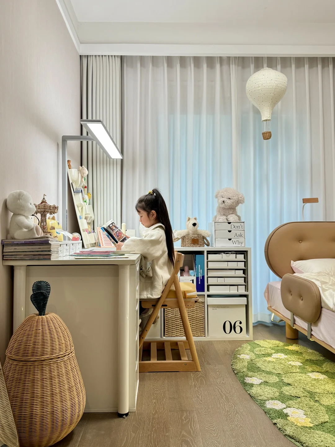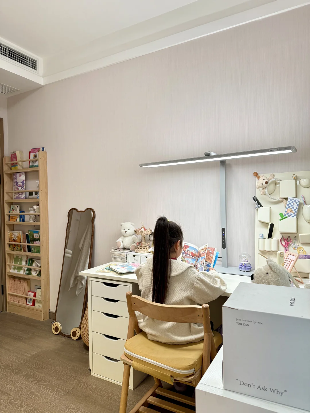 我还在书桌区搭了同品牌的孩视宝桌面大路灯,1米长灯头覆盖整个书桌,上下双光源把桌面和周围环境一起打亮,还有入席感应超智能,娃一坐就自动开关,和吸顶灯搭配起来,直接实现3楼儿童房“全屋补光+局部精护”,学习的氛围感和用眼舒适度直接拉满💯