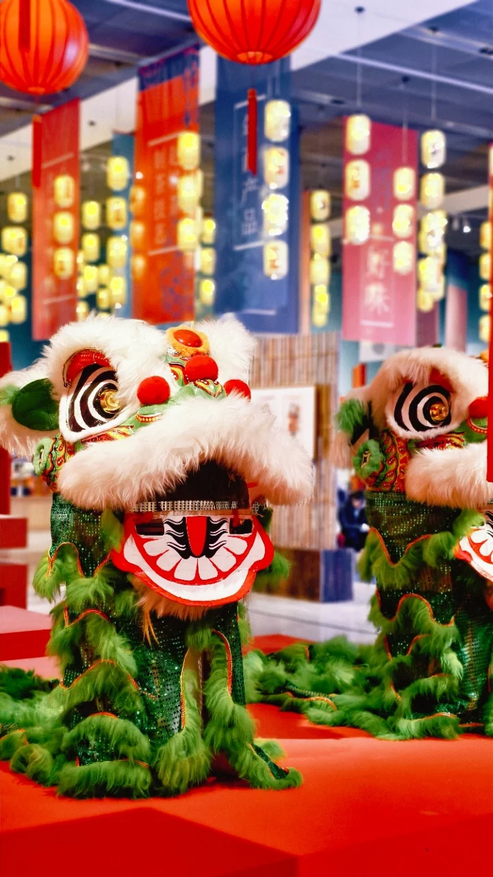 转头又看到了超可爱的醒狮头,绿毛毛亮闪闪的,和满墙的红灯笼相映,瞬间想起过年敲锣打鼓的热闹劲儿。