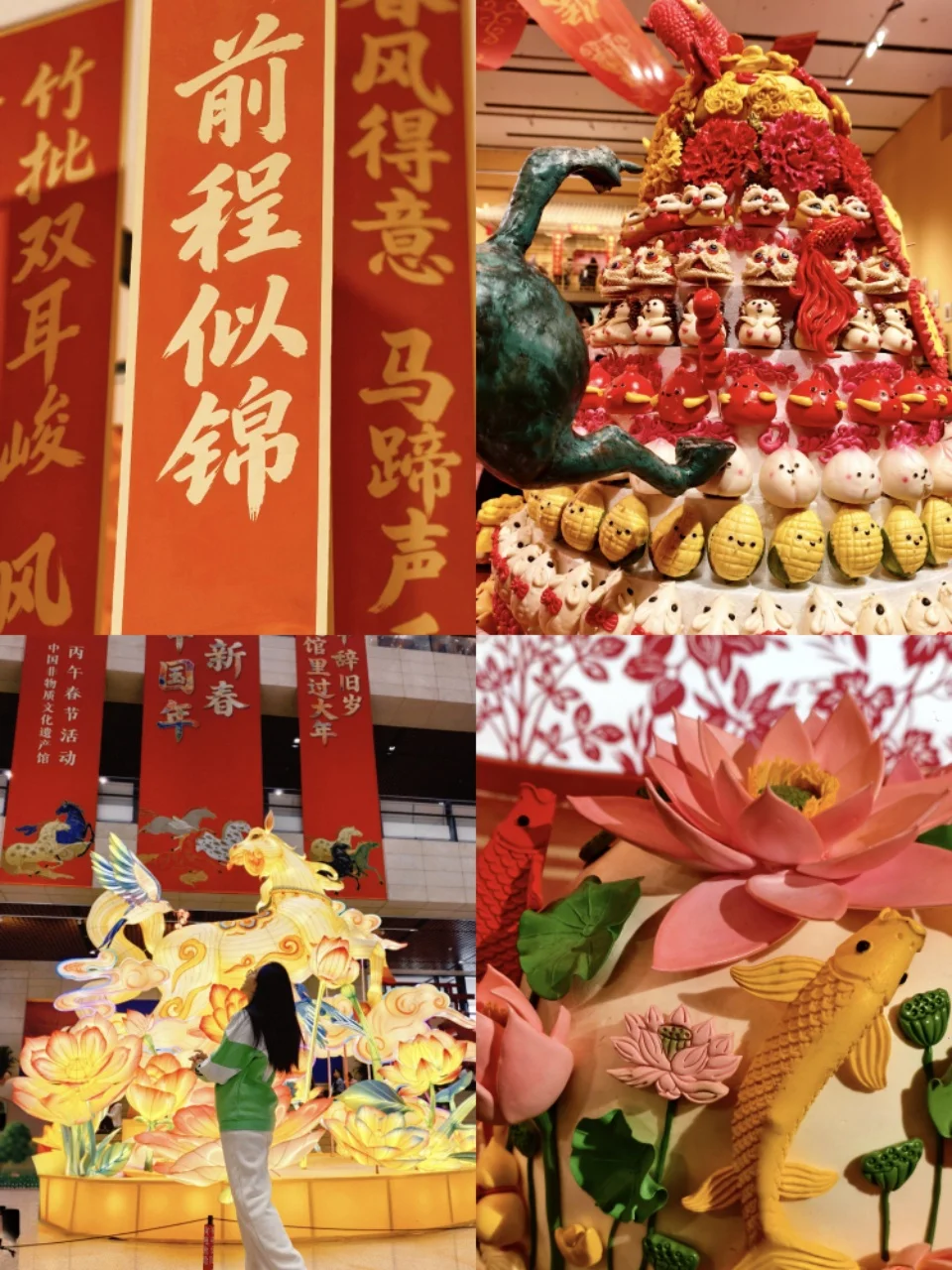 还有发光的金马灯,在花丛里闪着光,旁边的莲花灯层层叠叠,配着“前程似锦”的红对联,站在跟前许愿,心里都暖乎乎的。