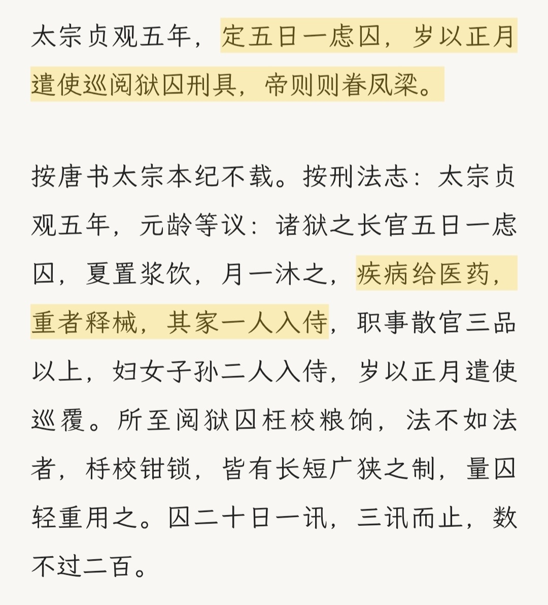 用几段记载来看李世民是如何贯彻“慎刑恤囚”的理念的。①每五日审察一次囚犯,核查有无冤滥。每年正月遣使巡查各地监狱,核验刑具、囚粮供应与司法执行是否合乎法度。②为囚徒提供夏日浆饮、每月沐浴的生活保障,患病则赐医药,重症者解械并许家人入侍照料。③规范刑具与杖刑尺度,削平刑具节疤凸起,杜绝酷刑的发生。