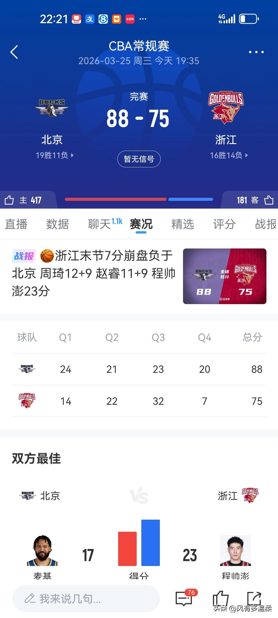 CBA篮球联赛30轮,北京主场迎战浙江稠州的比赛,北京笑到了最后。 整场比赛,北京与浙江稠州打的非常胶着,上半场北京以9分的优势领先结束。下半场比赛,第三节,浙江稠州奋起直追,打了一个23一32,三节结束,两队战成68一68平分秋色。单从这一节比赛,仿佛胜利偏向浙江一边,浙江稠州有了逆转北京的可能。比赛进入第四节,就在人们认为今天可以看到一场逆转取胜的比赛时,场上风云突变,浙江稠州队突然不会打球了,投篮各种不进。整节被北京打了一个20一7,浙江单节得7分创下了赛季新低,无奈饮恨败北。两队的胜场拉大到了三场,浙江稠州遗憾啊。 篮球浙江 北京首钢篮球赛