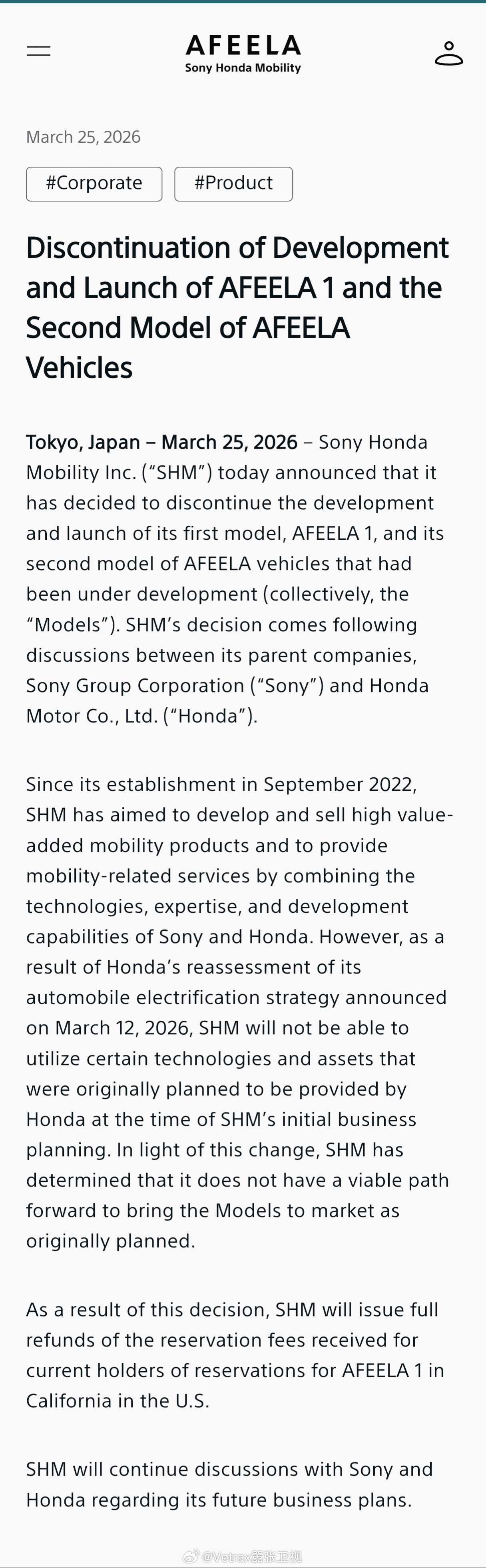 在去年的 CES 2025 国际消费电子展上,索尼与本田合力打造的电动车品牌 AFEELA 正式亮相。今年 1 月 2 日,索尼本田移动出行公司宣布,其首款电动车型 AFEELA 1 已在位于美国俄亥俄州的本田东利伯蒂工厂启动试生产。然而就过了两个月的时间,索尼和本田就在今天双方正式宣布将终止 AFEELA 系列电动汽车车型的开发与发布工作,并将退还所有预订者的订金。核心原因是本田,已调整其电动汽车战略,导致该合作项目难以继续推进……进后续索尼、本田、索尼本田移动出行三方,将就该业务的未来方针展开协商,也就是未来合资公司还能不能『存在』,都是个问号……