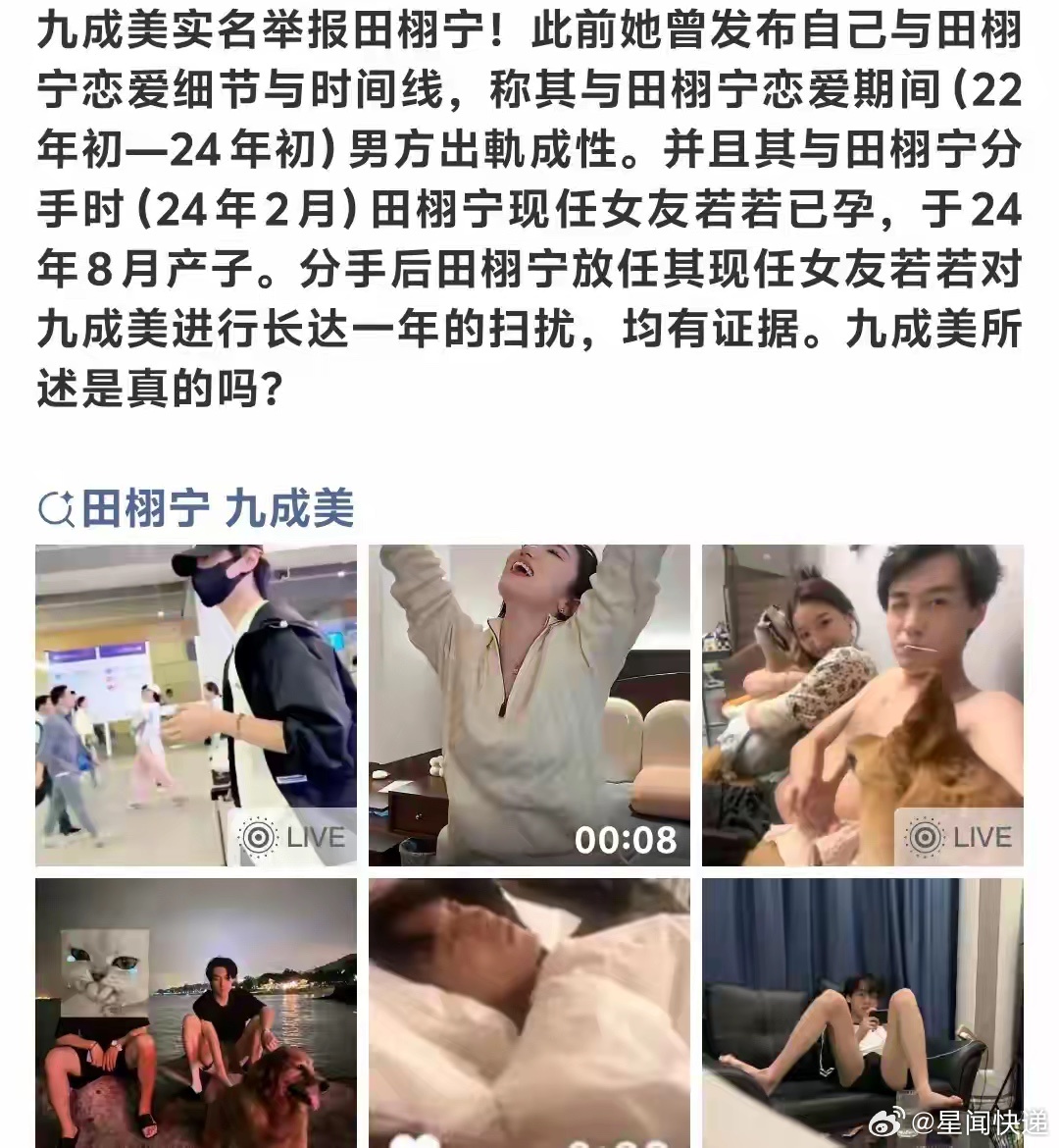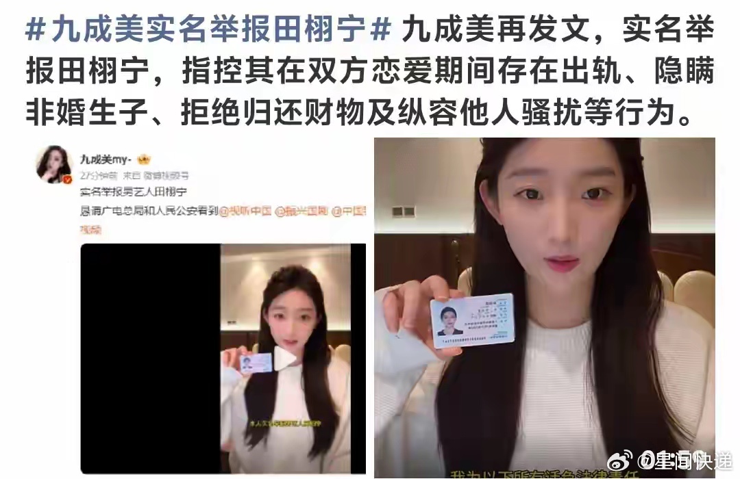 九成美实名举报田栩宁九成美再发文,实名举报田栩宁,指控其在双方恋爱期间存在出轨、隐瞒非婚生子、拒绝归还财物及纵容他人骚扰等行为。