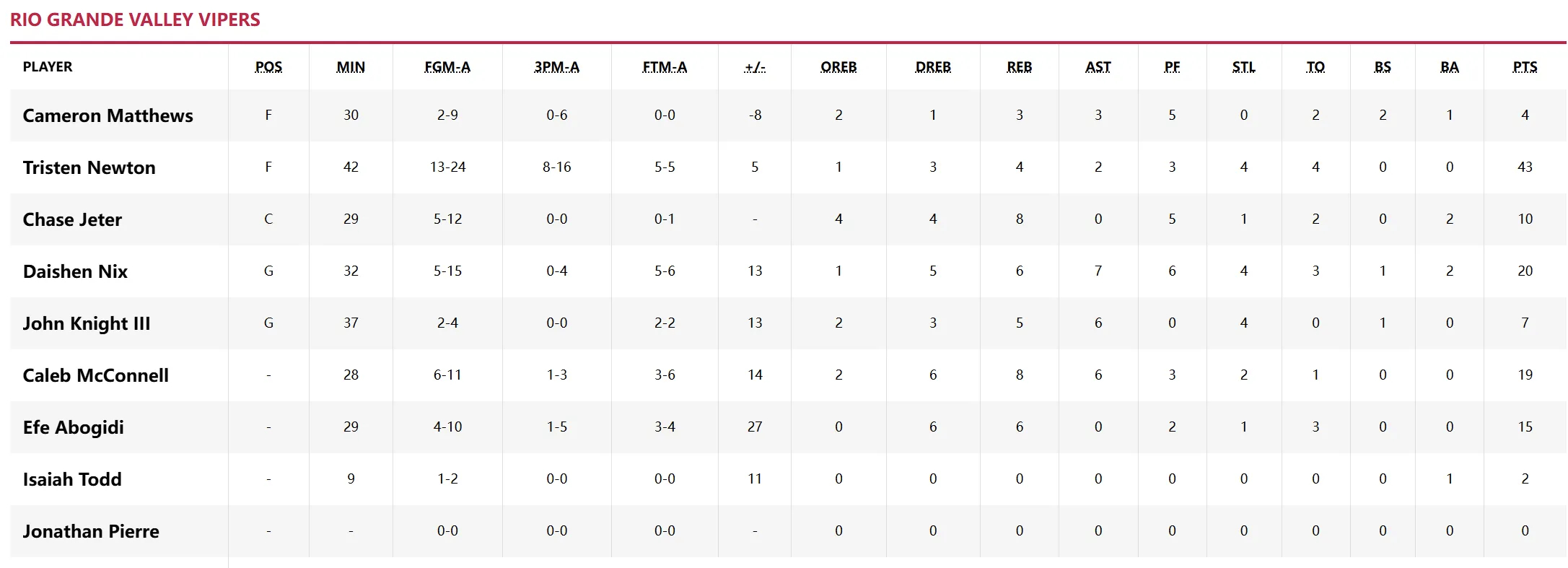 小蓝队今日在主场105:120不敌火箭下属球队里奥格兰德河谷毒蛇,托皮奇10中6得到14分1板8助4失误,巴恩海泽5分4板5失误,桑德福特10分4失误。