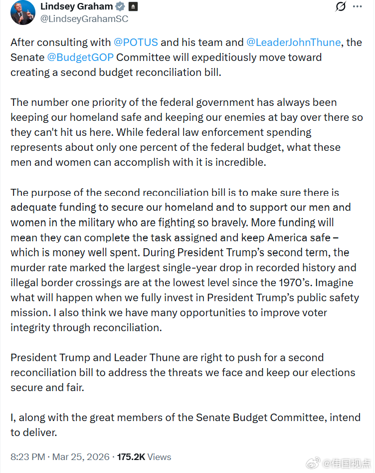 第二个调节法案的目的是确保有足够的资金保障我们的国土安全,并支持那些勇敢作战的军人。更多资金意味着他们能够完成分配的任务,保障美国安全——这笔钱花得非常值得。在特朗普总统第二任期内,谋杀率创下历史上最大单年下降幅度,而非法越境人数则降至自1970年代以来的最低水平。想象一下,当我们全面投入特朗普总统的公共安全任务时,将会发生什么。我还认为,通过调节法案,我们还有很多机会改善选民诚信。