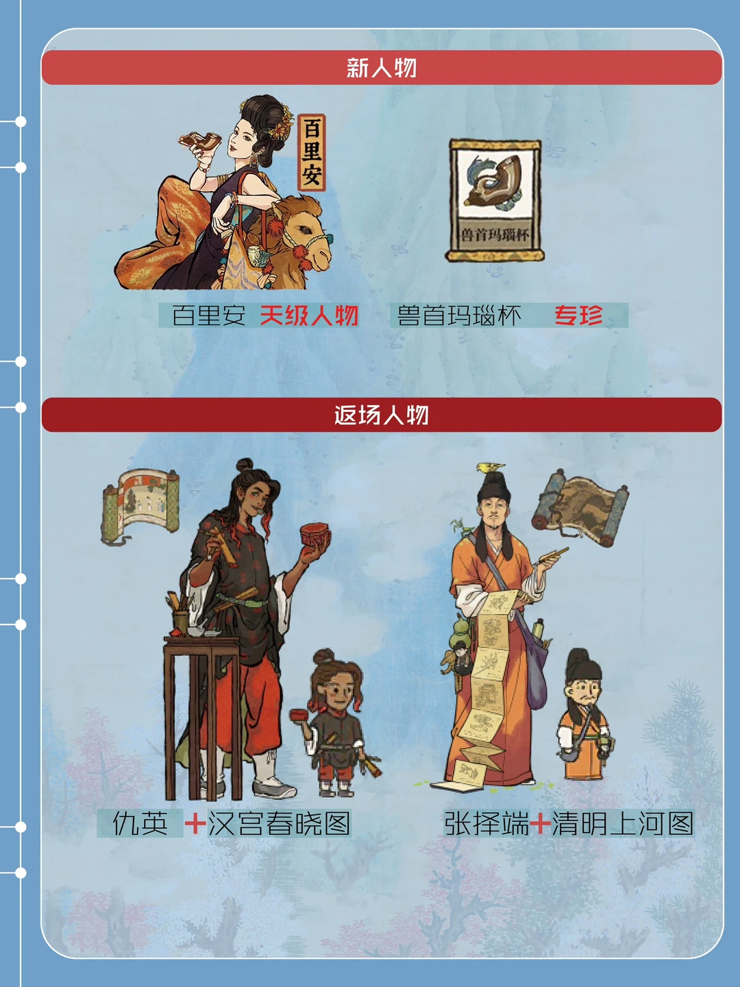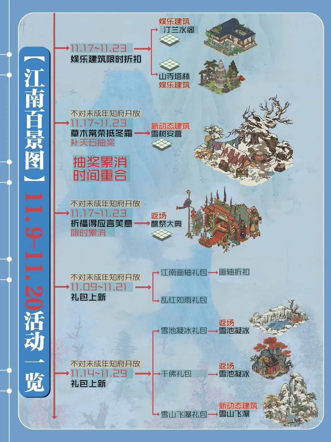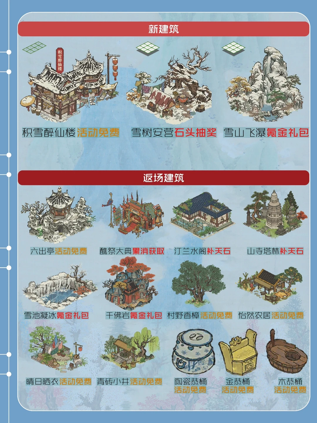 总结: 新建筑: 【积雪醉仙楼】活动免费获取 【雪树安营】补天石抽奖 【雪山飞瀑】礼包获取 新人物: 【百里安】 返场建筑: 【六出亭】【醮祭大典】【雪池凝冰】【千佛岩】【桃花村活动建筑】 府邸返场: 【金恭桶】【陶瓷恭桶】【木恭桶】