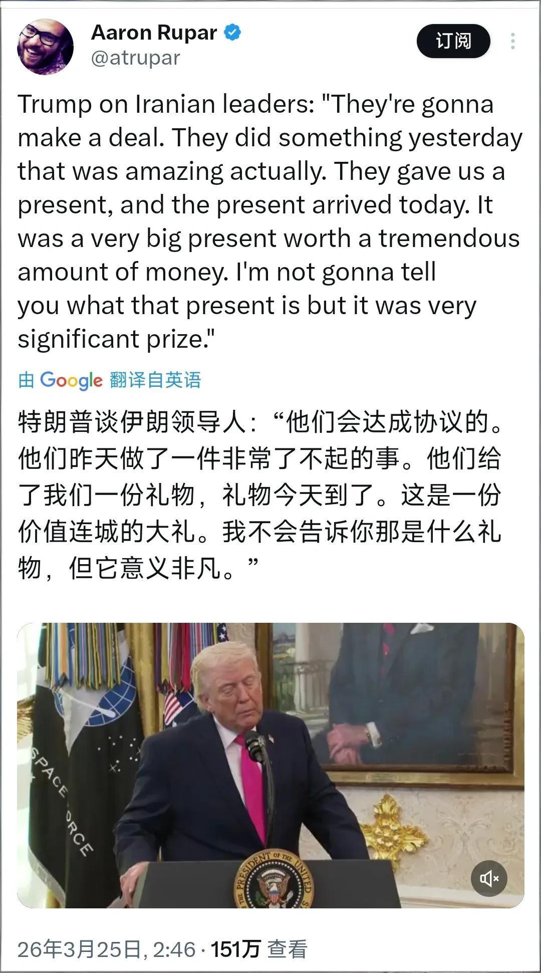 就在今天,特朗普又突然连发三文,中东战争出现新变化! 特朗普每一篇都直指中东战争,看似随口的表态,背后藏着的却是中东战局的关键转折,不把这件事看透,你根本不知道接下来中东会走向何方。 作为常年关注国际局势的人,我可以负责任地说,特朗普这三板斧,不是心血来潮,每一句都有深层目的。 特朗普今天连发的三文,表面上看是对中东战争的表态,实则矛盾重重。一边他说“这场战争已经胜利了,唯一想让战争继续下去的只有假新闻媒体”,这话听着底气十足,好像美伊之间的冲突已经尘埃落定,但另一边,据新华网3月25日报道,美国正考虑从第82空降师抽调兵力支援中东,同时通过第三方渠道与伊朗保持接触,并未明确提出和谈方案。 大家想想,要是战争真的胜利了,何必还要费这么大劲去调派兵力、保持接触?这其中的猫腻,其实就是特朗普的政治话术。 可能有人会问,特朗普到底在打什么算盘?其实很简单,他口中的“胜利”,根本不是真正的军事胜利,而是为了给自己造势,迎合国内的民意。 大家都知道,特朗普一直主张尽快结束中东冲突,减少美国在中东的军事投入,而他口中的“假新闻媒体”,不过是他转移焦点的工具,把战争未能快速结束的责任,推给媒体,自己则站在“和平推动者”的立场上,这就是他的政治套路。但咱们不能被他的话术迷惑,真正的战局,远比他说的要复杂得多。 再看他第二文里说的,伊朗给了他一份“价值连城的大礼”,还说“他们会达成协议的”,这话更是耐人寻味。很多人都在猜,这份大礼到底是什么?是伊朗同意了美国的和谈条件,还是交出了什么关键东西? 大家都知道,伊朗明确表示不会轻易妥协,除非美国满足核心条件,间接否认了近期和美达成和谈的可能。更有意思的是,3月24日当天,以色列还轰炸了伊朗伊斯法罕地区的关键炸药生产工厂,美以一边释放和谈信号,一边发动袭击,这哪里像是要达成协议的样子? 我分析,特朗普口中的“大礼”,根本不是什么实质性的好处,而是他用来迷惑外界的烟雾弹,是一场典型的信息战。一面他想通过这种说法,让外界觉得美伊和谈取得了突破,彰显自己的外交能力。 还有也是为了麻痹伊朗,让伊朗放松警惕,同时给国内民众一个交代,让大家觉得他在中东问题上取得了进展。而伊朗方面的表态,以及美以的突袭行动,恰恰说明这场“和谈罗生门”,背后是多方势力的暗战,谁都不想先让步,谁都想掌握主动权。 这也是我要跟大家说的第一个独家观点,特朗普的“大礼”,本质上就是信息战的工具,看似利好,实则暗藏杀机。 除此之外,还有一个大家容易忽略的点,也是我要跟大家分享的第二个独家观点,中东战争的新变化,不止是美伊之间的博弈,已经影响到了全球,尤其是咱们最关心的能源问题。 就在特朗普连发三文的当天,美国国防部已调派第82空降师约2000名士兵前往中东,该部队来自第82空降师的快速反应部队,能够在18小时内部署至全球任一地区。 大家可能不知道,这2000名美军的部署,可不是小事。第82空降师是美军的精锐部队,此次调派的部队包括第82空降师指挥官、数十名参谋人员及2个营的兵力,主要用于应对中东可能出现的突发情况。 一边与伊朗保持接触,一边增兵中东,特朗普的操作,看似矛盾,实则是两手准备:能通过接触控制中东局势,那就减少军事投入;要是接触失败,就靠军事力量施压,确保美国在中东的利益不受损失。 而美军的增兵,必然会加剧中东的紧张局势,油价也会跟着波动,咱们国内的油价走势,或多或少都会受到影响。 还有特朗普第三文里吐槽的,说国防部长皮特不想解决伊朗战争,还说“他们对和解不感兴趣,他们只想赢”。 很多人可能觉得,这只是特朗普随口的抱怨,但其实背后是白宫与五角大楼的权力拉扯。他属于典型的“鹰派”,一直主张通过军事手段解决中东问题,与特朗普的主张存在明显分歧。 特朗普这次公开吐槽国防部长,其实也是在向五角大楼施压,逼他们配合自己的中东政策,同时也是在向国内民众表明,自己是真心想推动和平,要是战争继续,责任不在自己,而在军方。 这种权力拉扯,其实也反映出美国内部在中东政策上的分歧,而这种分歧,必然会影响到中东战局的走向。 大家可以想一想,连美国自己内部都没达成一致,所谓的“和谈”“胜利”,又能靠谱到哪里去? 可能有人会问,那中东战争到底会走向何方?美伊接触能有实质性进展吗? 我个人认为,从目前的情况来看,难度很大。一方面伊朗的停战条件是:美国解除所有经济制裁、给出不干涉伊朗事务的国际法律保障,同时赔偿伊朗相关损失,这与美国的核心诉求存在巨大分歧。 另一方面,以色列也不会轻易让步,3月24日以色列刚刚轰炸了伊朗的炸药工厂,以色列担心伊朗拥有核能力,威胁到自己的安全,所以必然会从中作梗。 特朗普今天连发的三文,看似是简单的表态,实则是一场包含政治话术、信息暗战、权力拉扯的复杂博弈。 来源: 外媒x平台