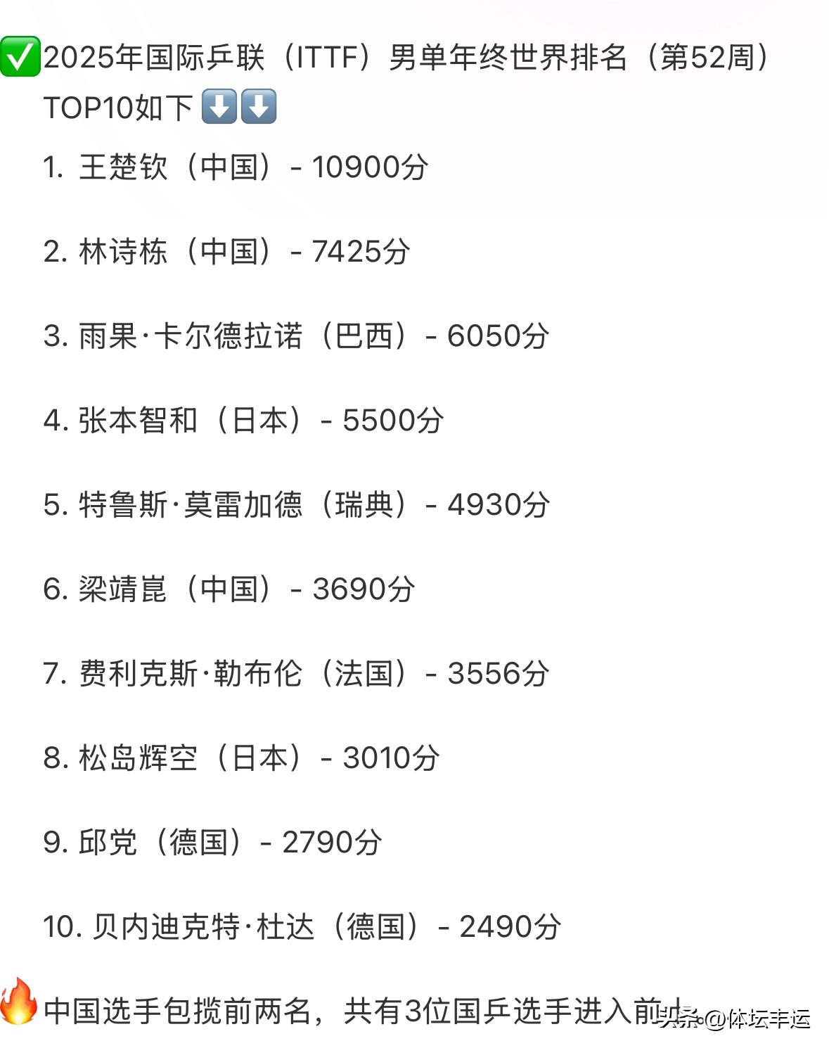 中国的乒乓球有多厉害? 刚刚国乒男队第二次选拔赛结束,向鹏3 - 1战胜温瑞博,获得伦敦世乒赛团体资格! ✅这场选拔赛堪称“死亡剧本”,7人参赛、单败淘汰,抽签结果也很刺激。向鹏的晋级之路是“地狱模式”,1/4决赛决胜局10比8手握赛点还被追平,最终13比11险胜;半决赛1比2落后逆转;决赛也是“心跳对决”,第四局10平后,向鹏一记正手爆冲锁定胜局,夺冠后他仰天怒吼。 ✅理论上国乒5个参赛席位已揭晓⬇️ 1️⃣王楚钦,2025多哈世乒赛男单冠军; 2️⃣樊振东,2025全运会男单冠军; 3️⃣林诗栋,世界排名第二; 4️⃣周启豪,第一次选拔赛冠军; 5️⃣向鹏,第二次选拔赛冠军!