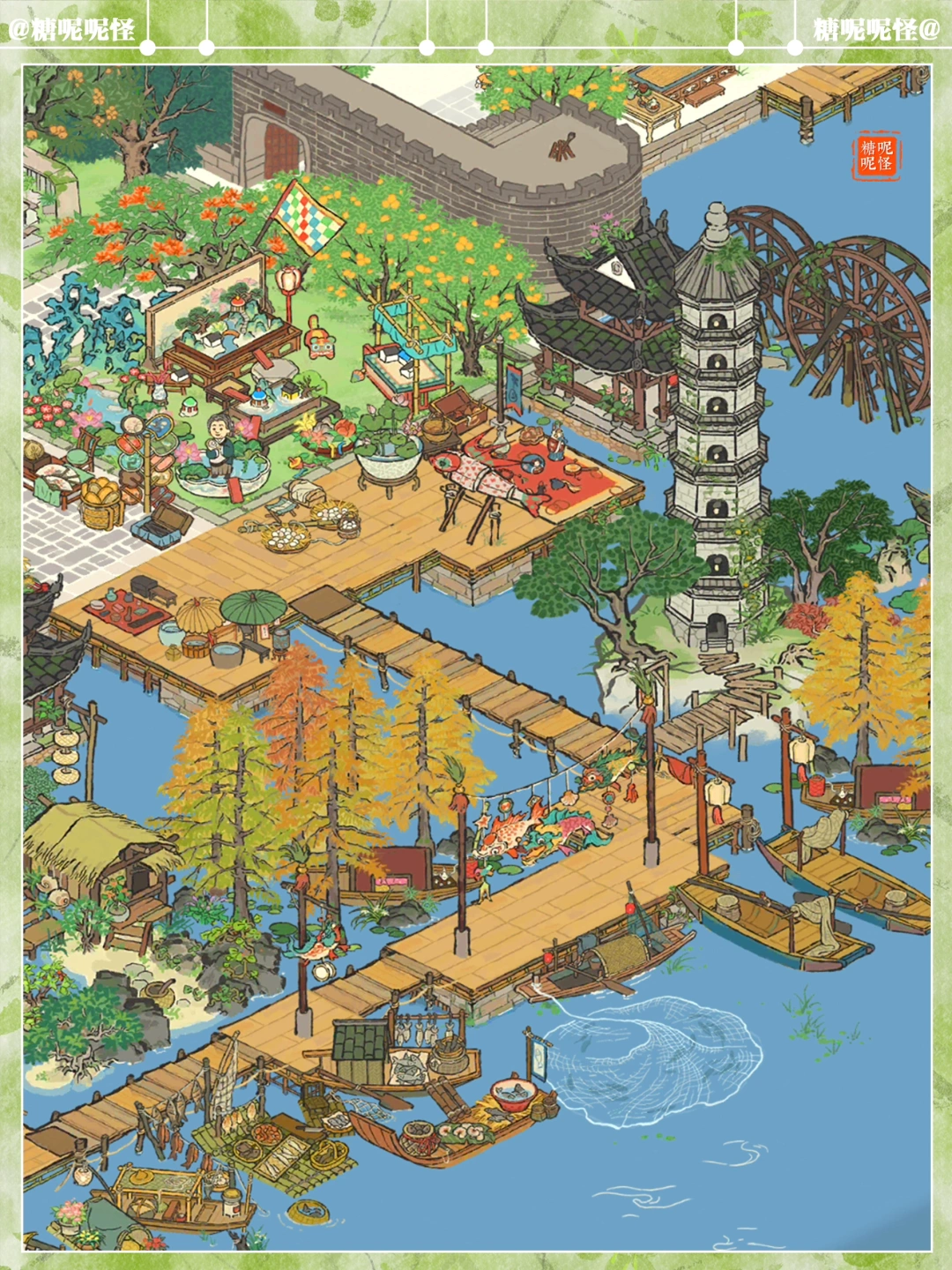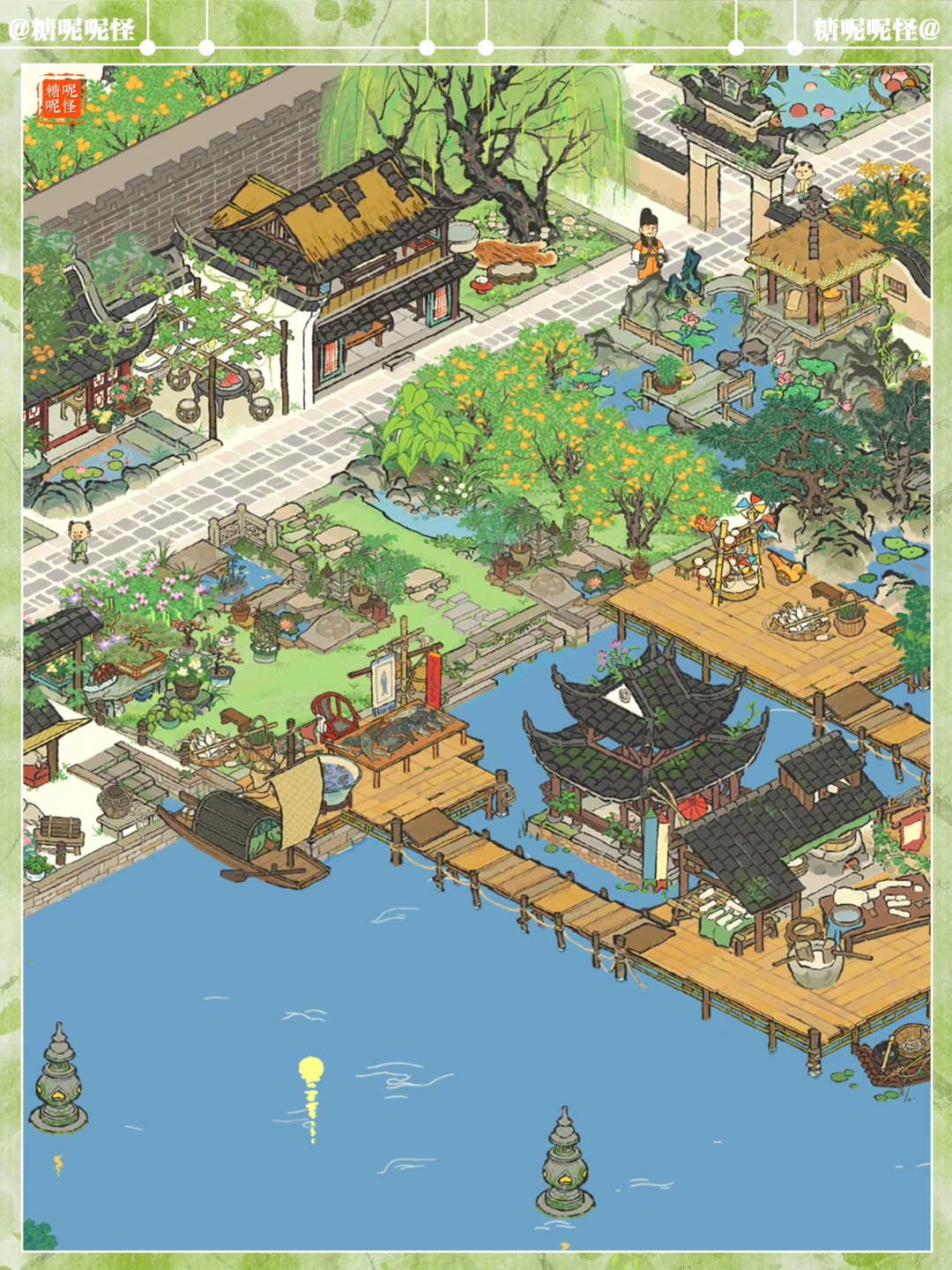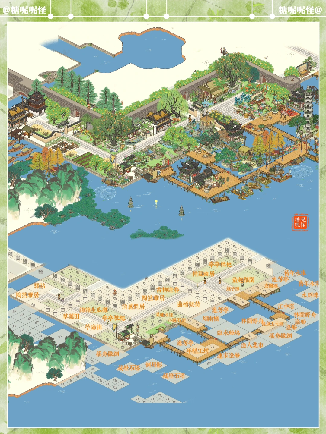 宁波府卖鱼巷+后塘巷布局 建筑:陶然雅居|驿站|亭亭枇杷|消暑闲居|古柳迎春|仲夏幽居|曲桥观荷|童趣稚园|烟雨桥|林间野舟|摇舟撒网|临水船坞|连家渔船|渔人集市|江中塔|池芳亭|绵绵生瓜藤|苎麻田|草药田|倒月影|藏灯石塔|小园石径|菜畦水洼 mhjh3embxr2