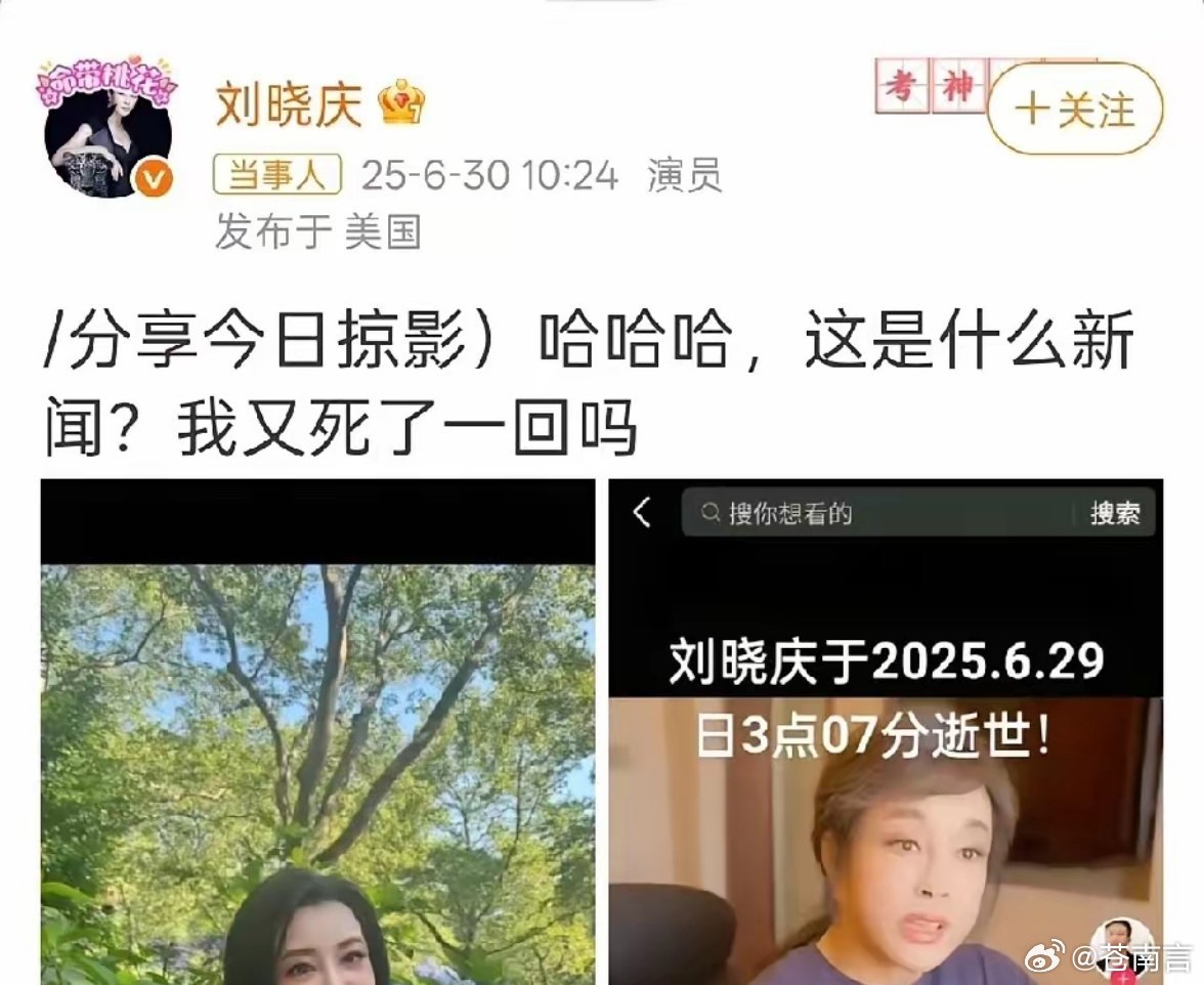 刘晓庆再发文辟谣去世刘晓庆转发贴文并在线辟谣: “刚刚,又看到我去世的消息,这是杀人预告吗?这么想我si啊,“本是同根生,相煎何太急”! 这已经不是刘晓庆第一次辟谣去世传闻了,2025年6月30日,她也曾被造~谣去世,当时她还发自拍并幽默回应“我又si了一回吗?”。时隔9个月,又有人故技重施,这次庆奶明显有点愤怒,有些人真是毫无底线啊