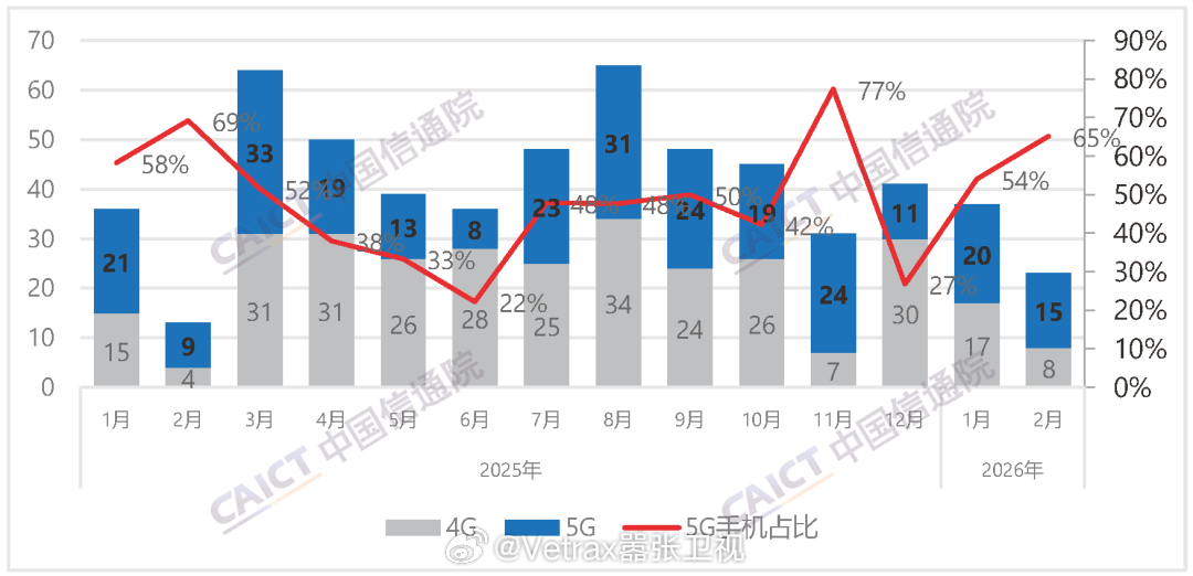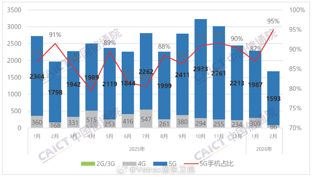 来看看 2026 中国手机市场『一路向下』的走势——中国信通院发布 2026 年 2 月国内手机市场运行分析报告:继 1 月同比大幅下滑之后,2 月再度同比大幅下滑,2月份国内市场手机出货量 1678.9 万部,同比下降 14.6%,其中 5G 手机 1593.1 万部,同比下降 11.4%。