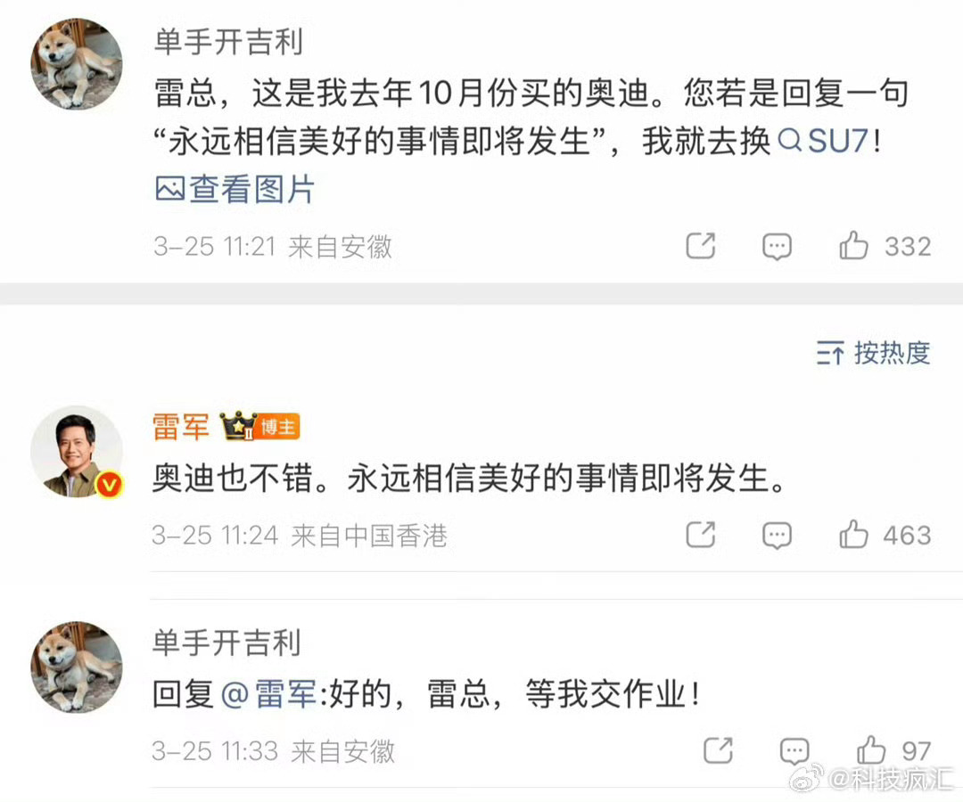 一位网友在雷总微博评论区留言,只要雷总回复一句“永远相信美好的事情即将发生”,他就马上奥迪换SU7!结果雷总真的回复了!坐等这位网友交作业!