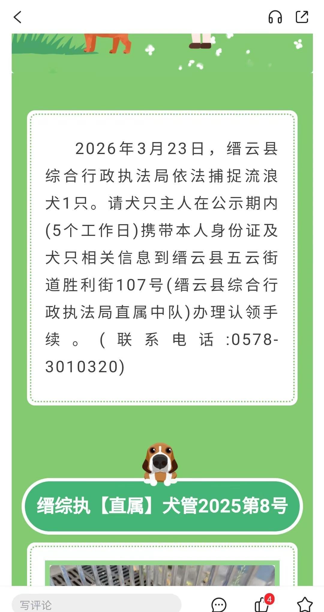 浙江省丽水缙云县犬办2026.3.23日。缙云寻狗 1只狗狗转自"掌上缙云"小程序浙江省丽水缙云县2026.第7期犬只公示,抓捕地缙云县五云街道大桥南路。5个工作日,丢狗主人赶紧快去领"掌上缙云"小程序收容狗狗公示。下载"掌上缙云"小程序,搜犬只公示,有收容狗狗会不断更新公示。缙云县公示是从2025年第1期开始的,2025年以前的没有显示。 缙云寻找狗主人 缙云县 缙云丢狗