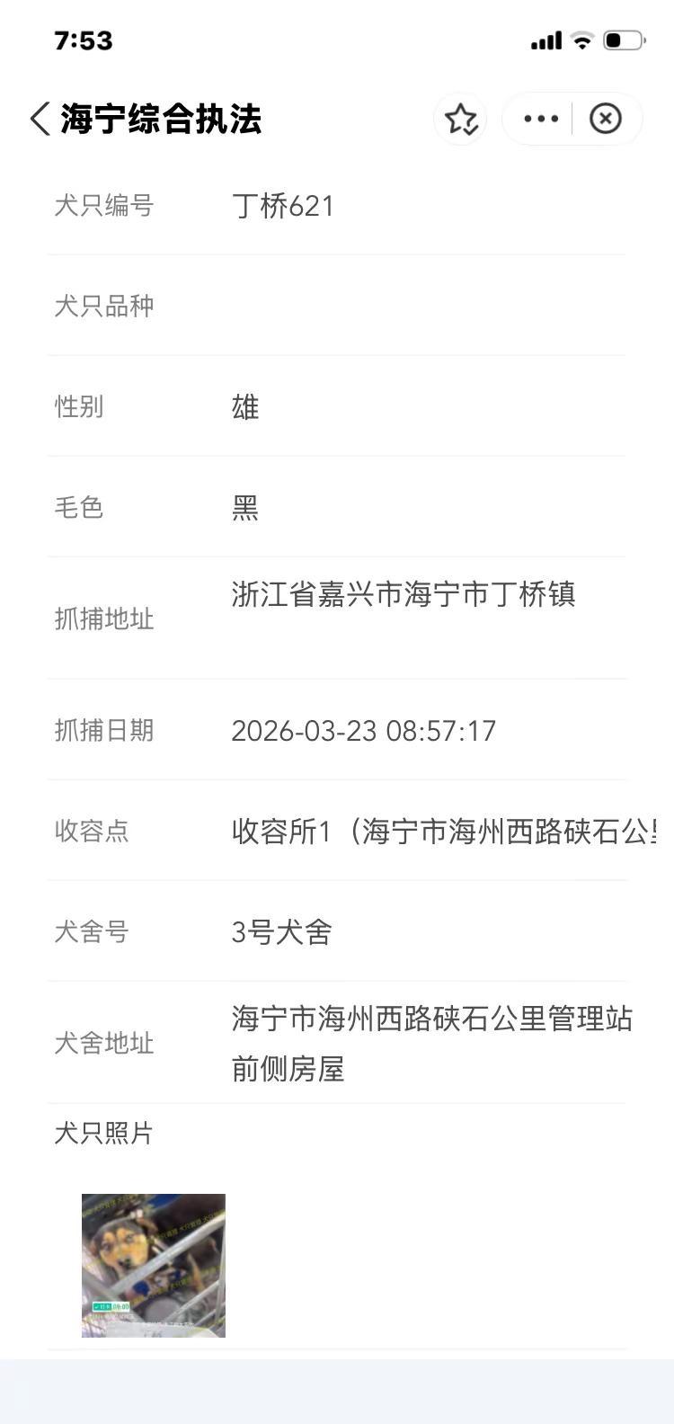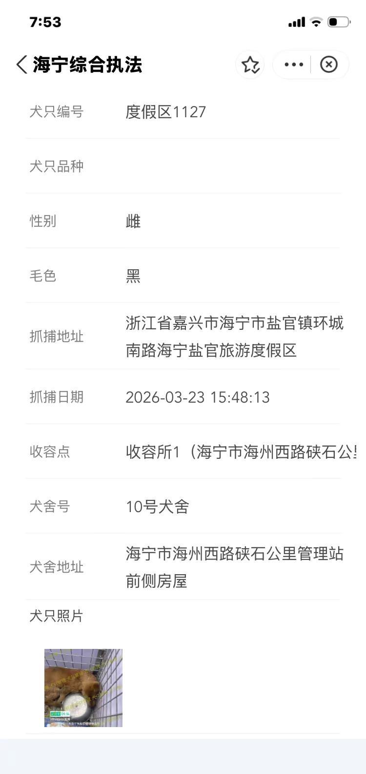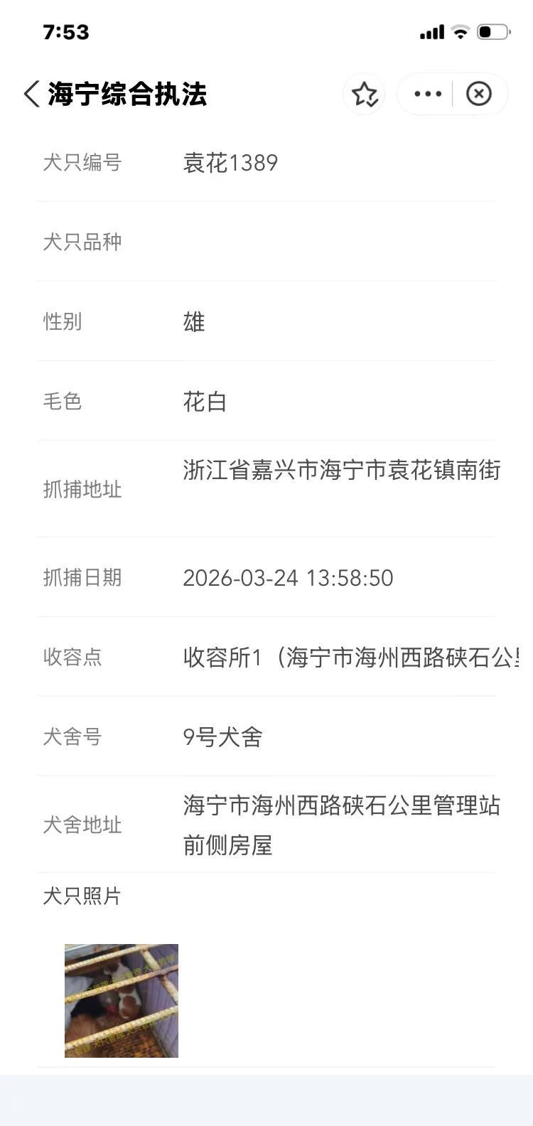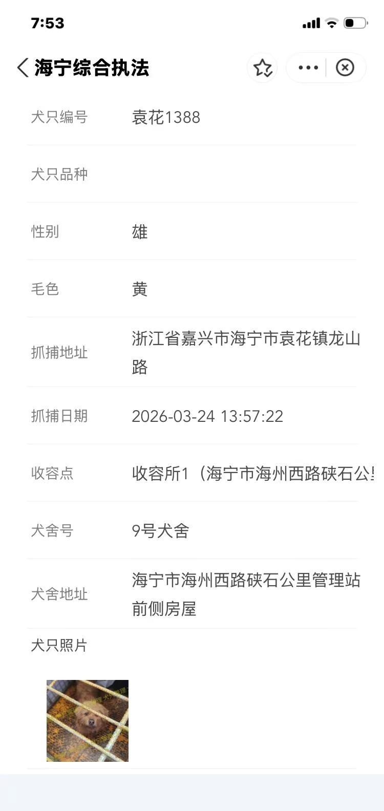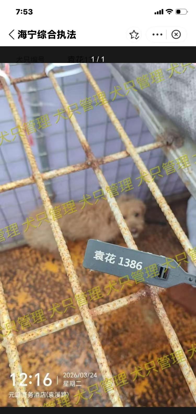 浙江浙里办嘉兴海宁市2026.3.24日。海宁寻狗今天海宁市有新增有要下架,只有三天公示时间。抓捕地袁花镇南街,袁花镇龙山路,袁花镇花溪街,袁花镇花溪街元庭,盐官镇环城南路海宁盐官旅游度假区海宁抓狗基本都在海昌街道,海洲街道,马桥街道,硖石街道,黄湾镇,丁桥镇,斜桥镇,盐官镇,袁花镇,长安镇等范围。嘉兴海宁县找狗去某宝搜索浙里办小程序找到海宁综合执法进入,选择文明养犬~自主申办~犬只公告。时间有限 海宁找狗 海宁盐官镇寻狗 海宁袁花镇寻狗