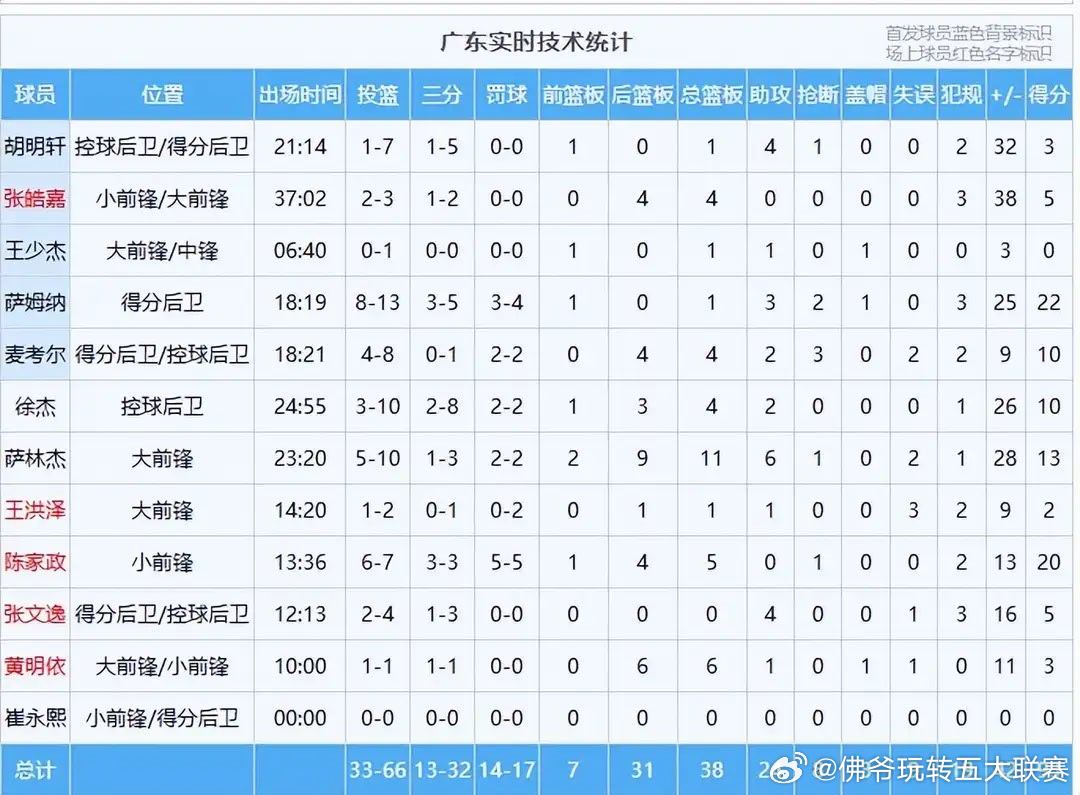 📊 核心数据与球员表现从技术统计来看,广东队全场投篮33投66中,三分球13投32中,罚球14投17中,总篮板38个,助攻24次,多项数据全面压制对手,具体球员表现更是两极分化: