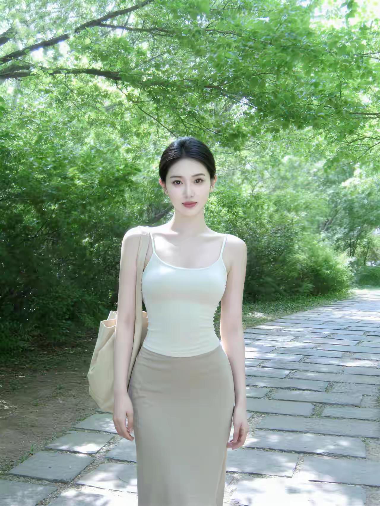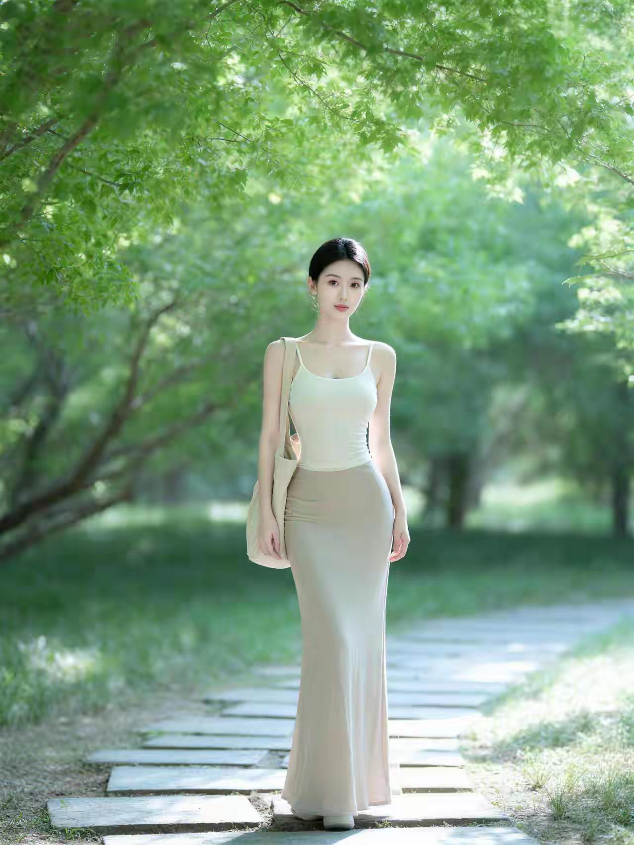 她身着一套简约的浅色系吊带长裙,上身为米白色修身吊带,勾勒出流畅的肩颈线条,下半身是同色系的包臀鱼尾长裙,垂坠感极佳,完美展现出曼妙身姿。整体色调温柔素雅,尽显低调的奢华感。 乌黑的秀发被利落盘起,露出精致的五官,眉眼清冷,红唇点缀,气质清冷又不失妩媚。她行走在绿意盎然的林间石板路上,阳光透过层层叠叠的树叶洒下斑驳光影,微风轻拂,氛围感拉满。 整体画面清新自然,将清冷、优雅、随性的气质融为一体,仿佛是从油画中走出的森系美人,每一帧都充满了治愈感。