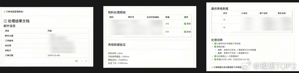 原来的流程:收到供应商发来的采购订单PDF,员工对照邮件内容,逐行核对物料编号、零件号、数量、交期,然后在飞书表格里手动更新或新增记录。每封邮件,几十行数据,容易出错,也耗时间。